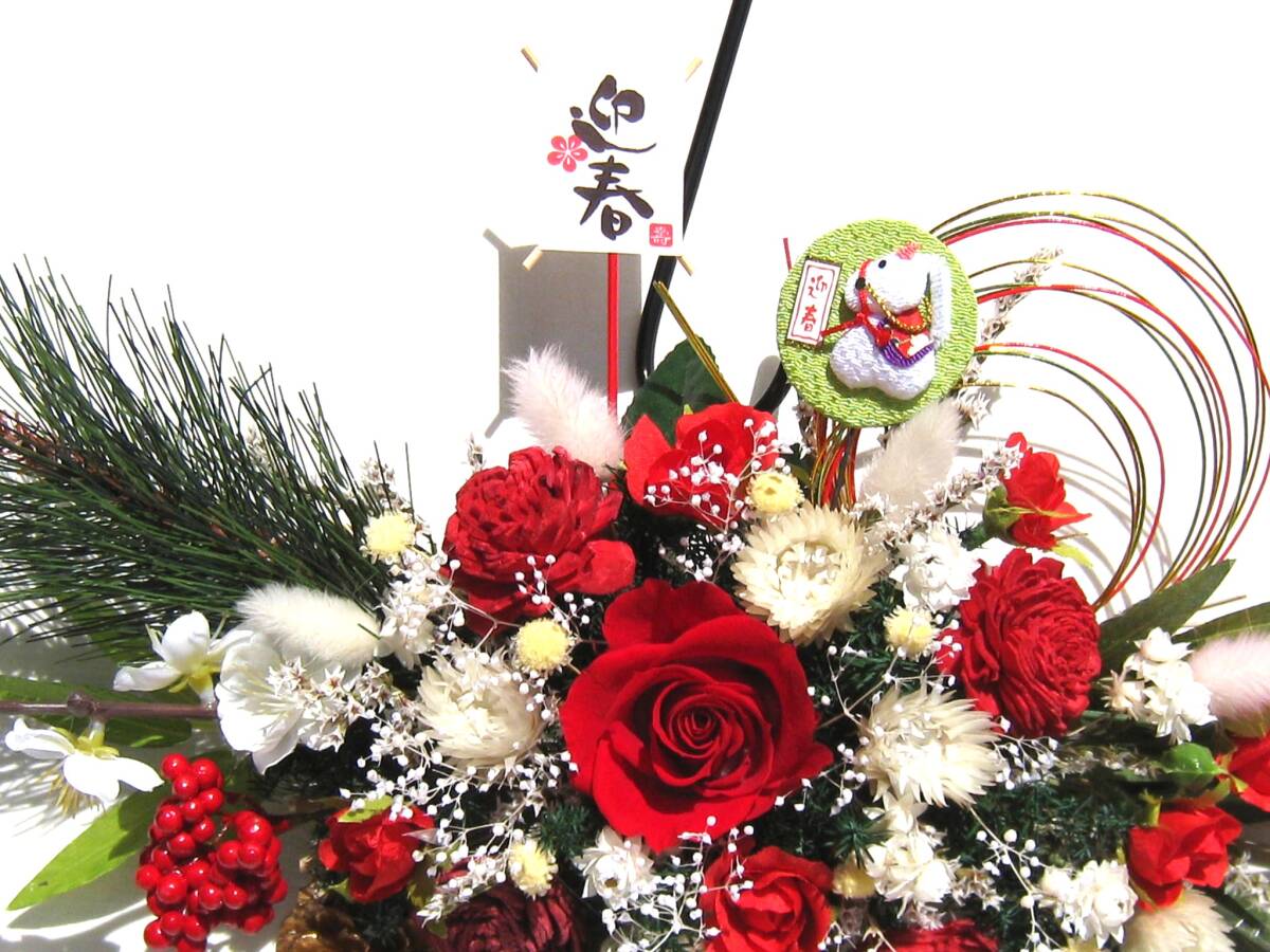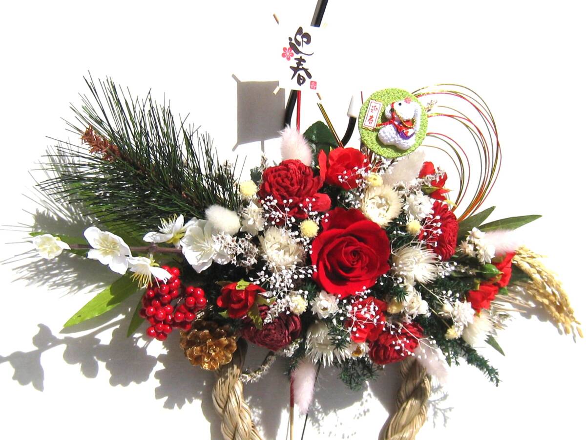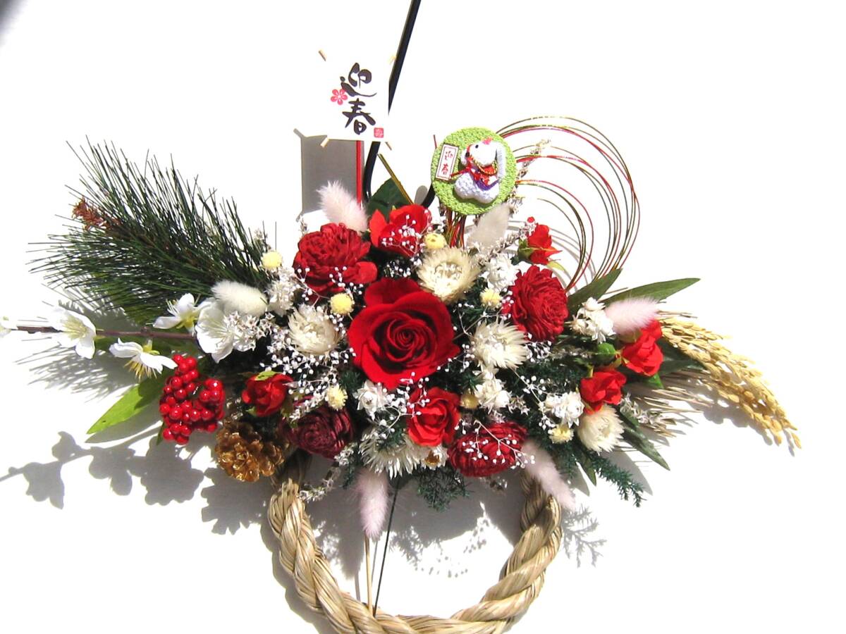 稲穂付き丸しめベースに松竹梅、千両、プリザーブド薔薇、シルバーデージー、マルガリータ、