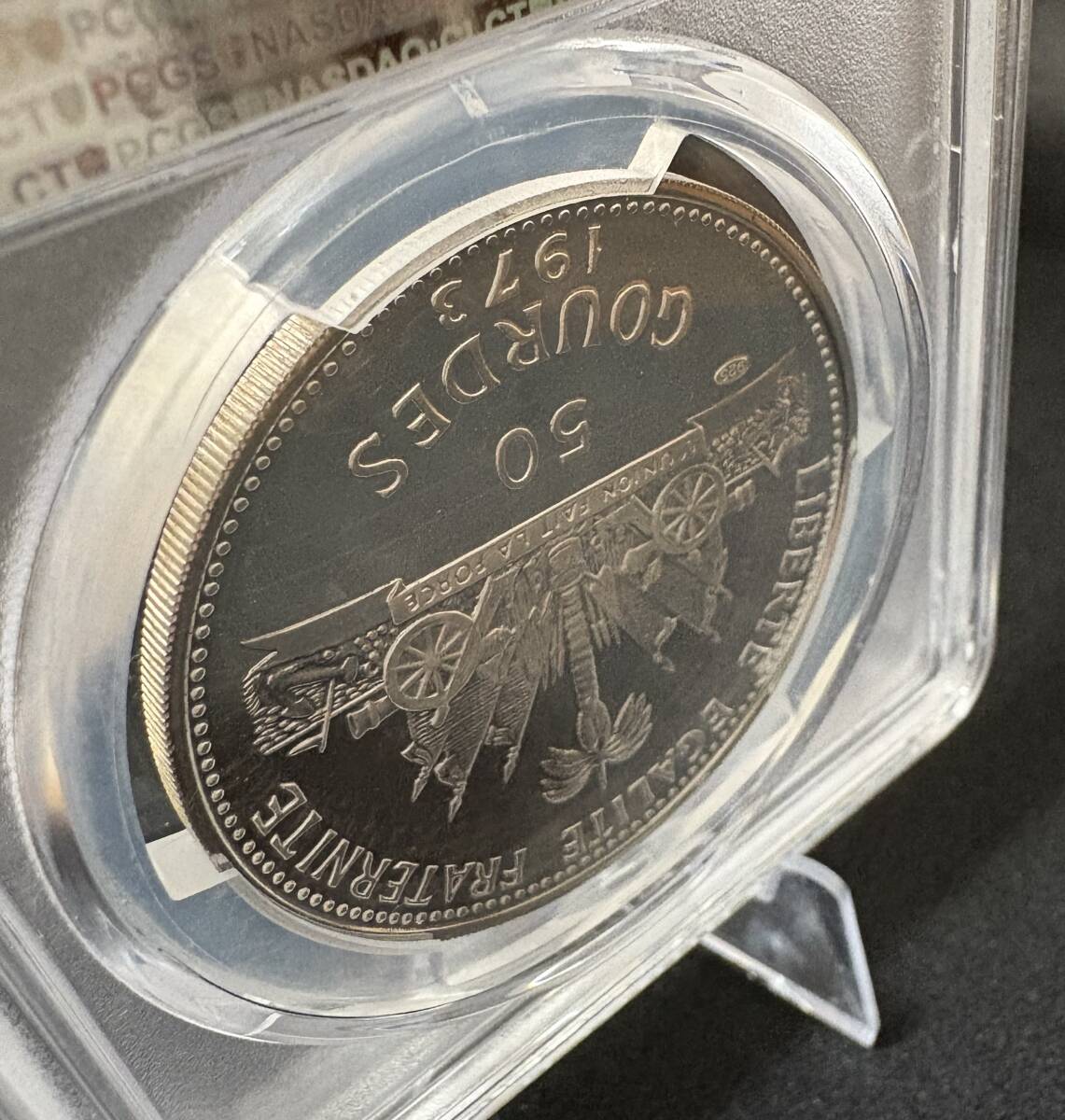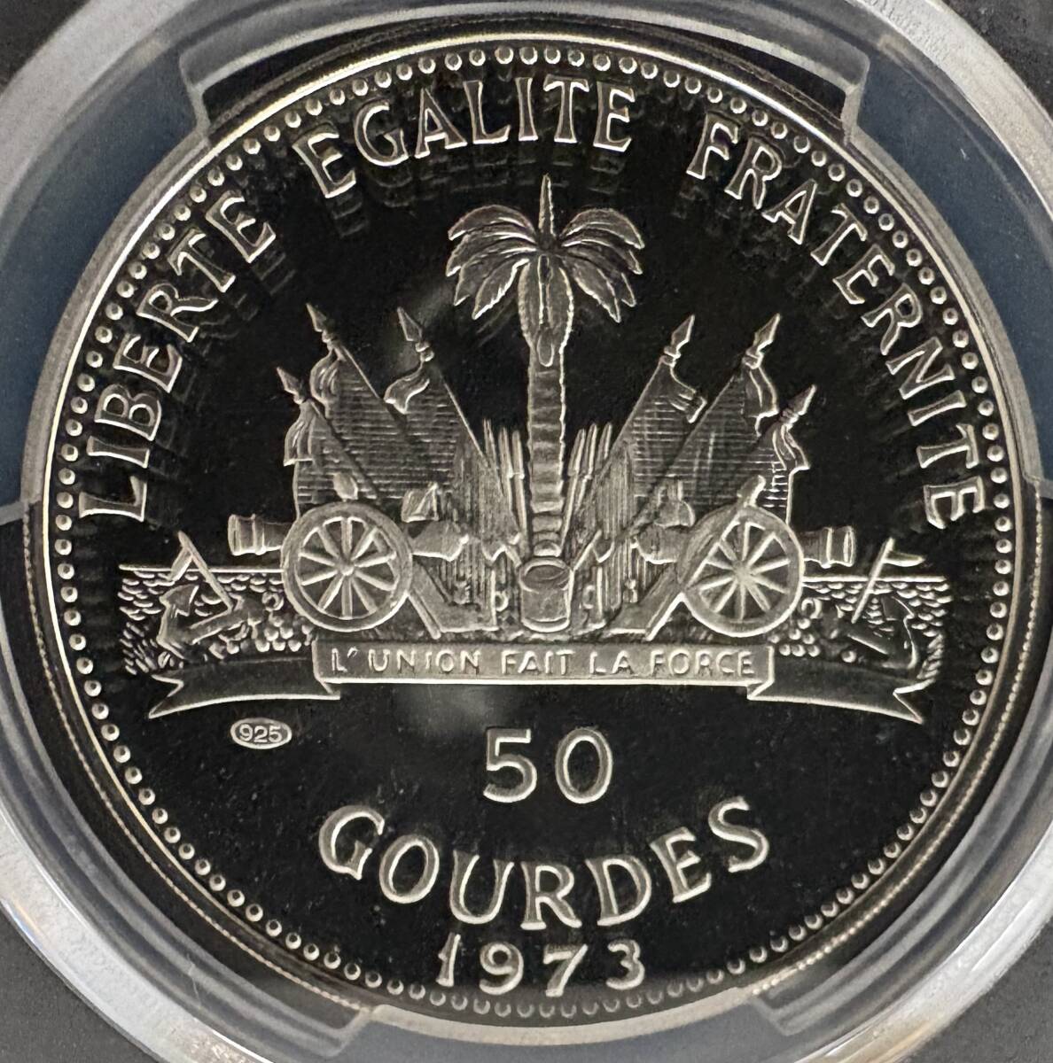 裏面はハイチ共和国の国章(パームツリー、旗、武器、リボンなどを含む象徴的な紋章)を中央に配置。額面50 GOURDESと年号1973が刻まれプルーフならではの深い鏡面が輝きます。