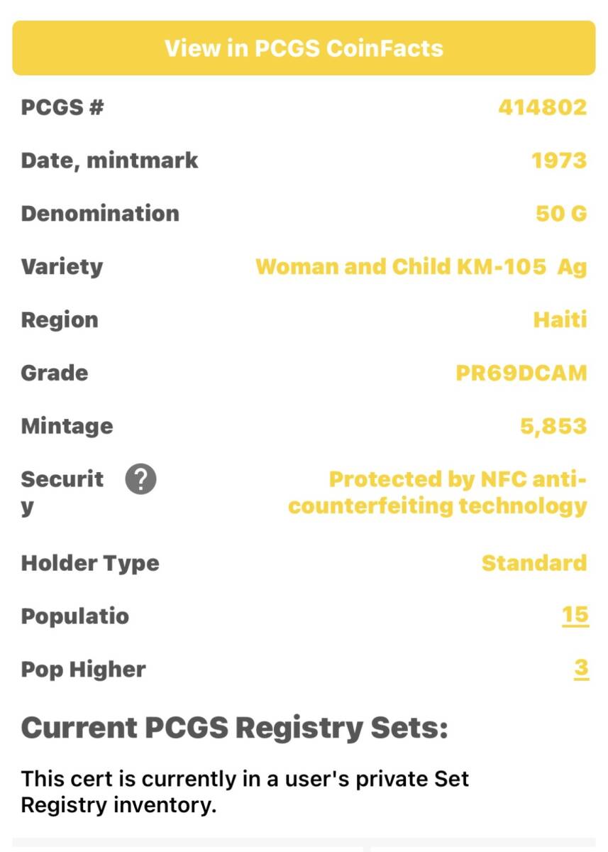 世界で15枚!1973年 PCGS PR69DCAM ハイチ 子を抱く母 50グールド 銀貨 安全資産 モダンコイン 投資 silver 高鑑定