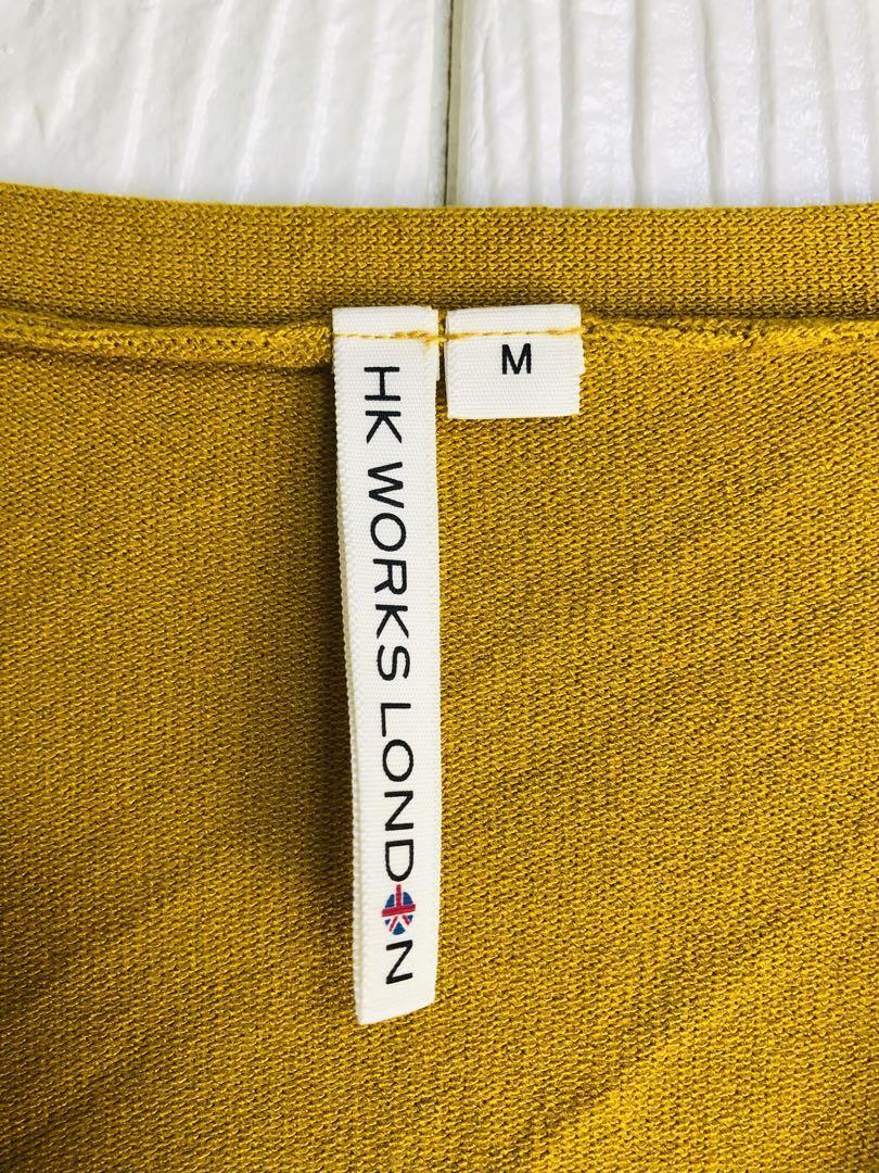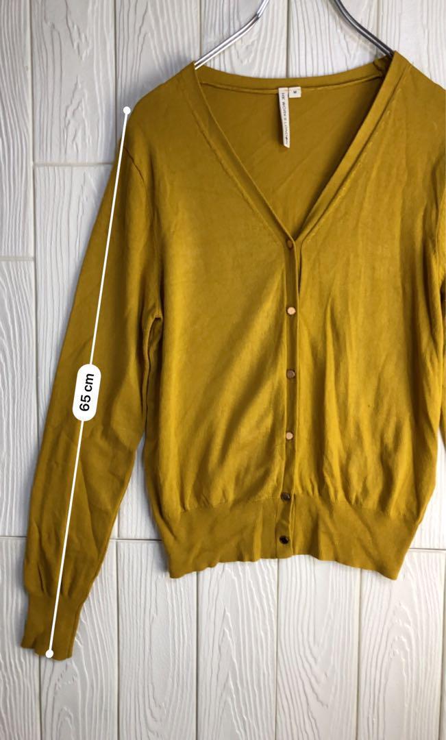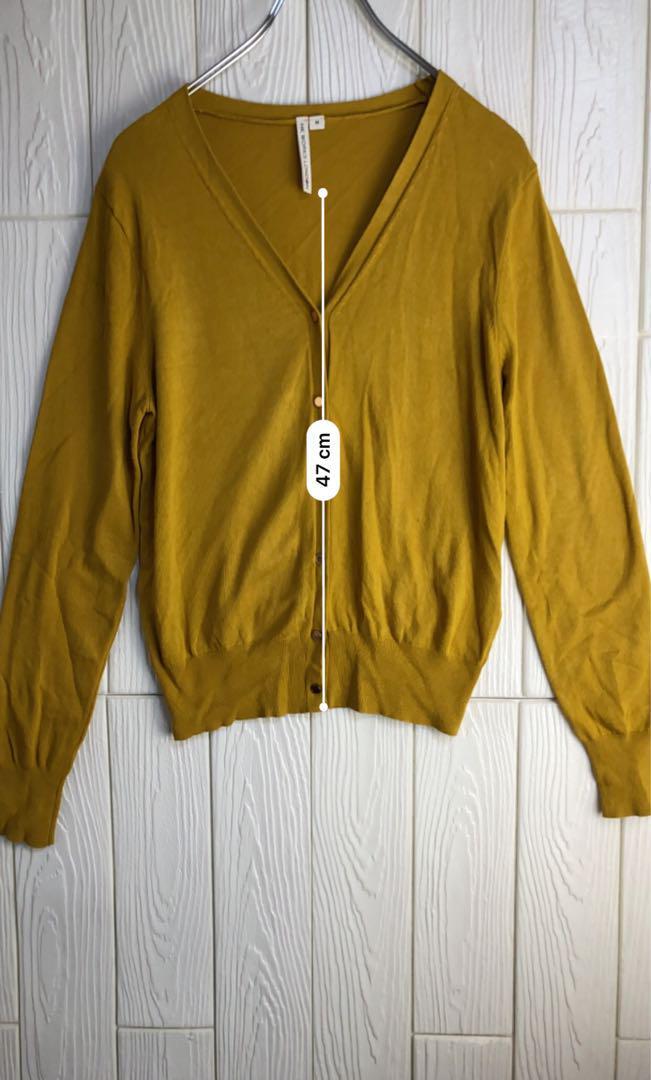 マスタードカラーの長袖カーディガン、シンプルで着回しやすいデザイン。