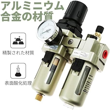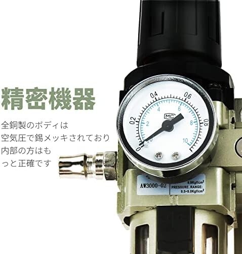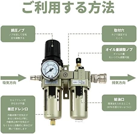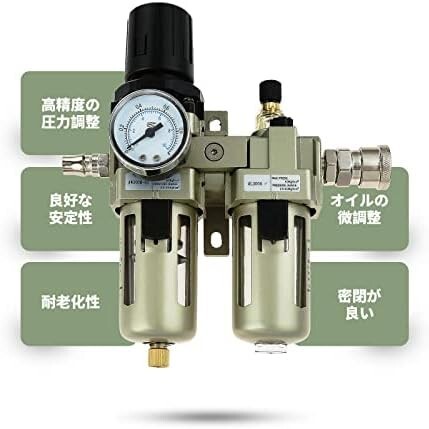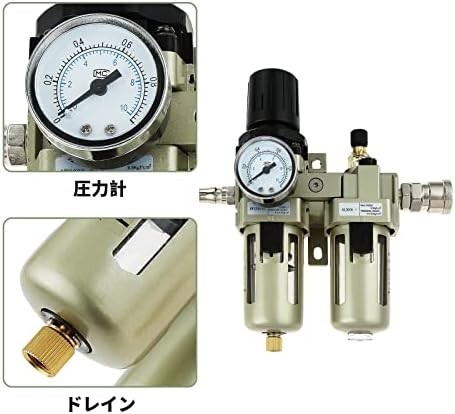 • 【圧力調整】エアーコンプレッサーから空気中に存在する水分を除去するウォーターセパレーターです。高圧の気体を一定の圧力へ下げられ、圧力を楽に調整できます。エアコンプレッサー、エアブラシやエアーサンダー等のエア駆動工具を使用する時には肝心なことです。