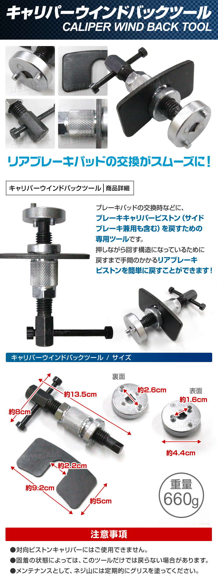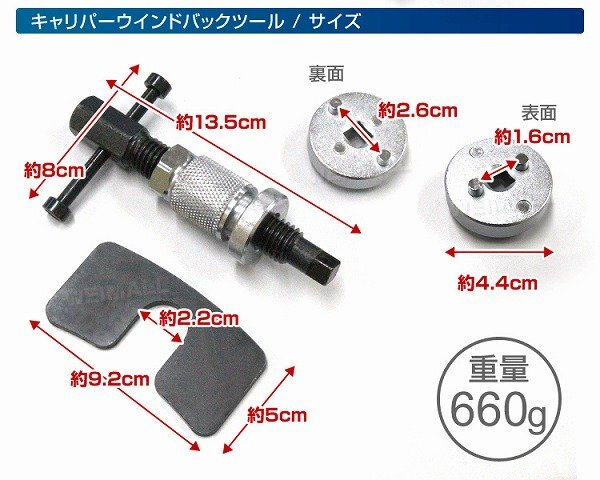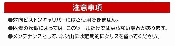 リアブレーキパッドの交換がスムーズに! ブレーキパッドの交換時などに、 ブレーキキャリパーピストン(サイドブレーキ兼用も含む)を戻すための専用ツールです。 押しながら回す構造になっているために 戻すまで手間のかかるリアブレーキピストンを簡単に戻すことができます! 【商品仕様】 本体 アタッチメント(表、裏で2種類) ウエス 【注意事項】 ・取扱説明書は付属しておりません。 ・対向ピストンキャリパーには利用不可です。 ・固着の状況により、このツールだけでは戻らない場合もあります。 ・メンテナンスとしてネジ山には定期的にグリスを塗りご利用ください。 ・商品は、モニターによって色合いが異なって見える場合があります。 ・仕様・デザインは改良のため予告なく変更することがあります。 |