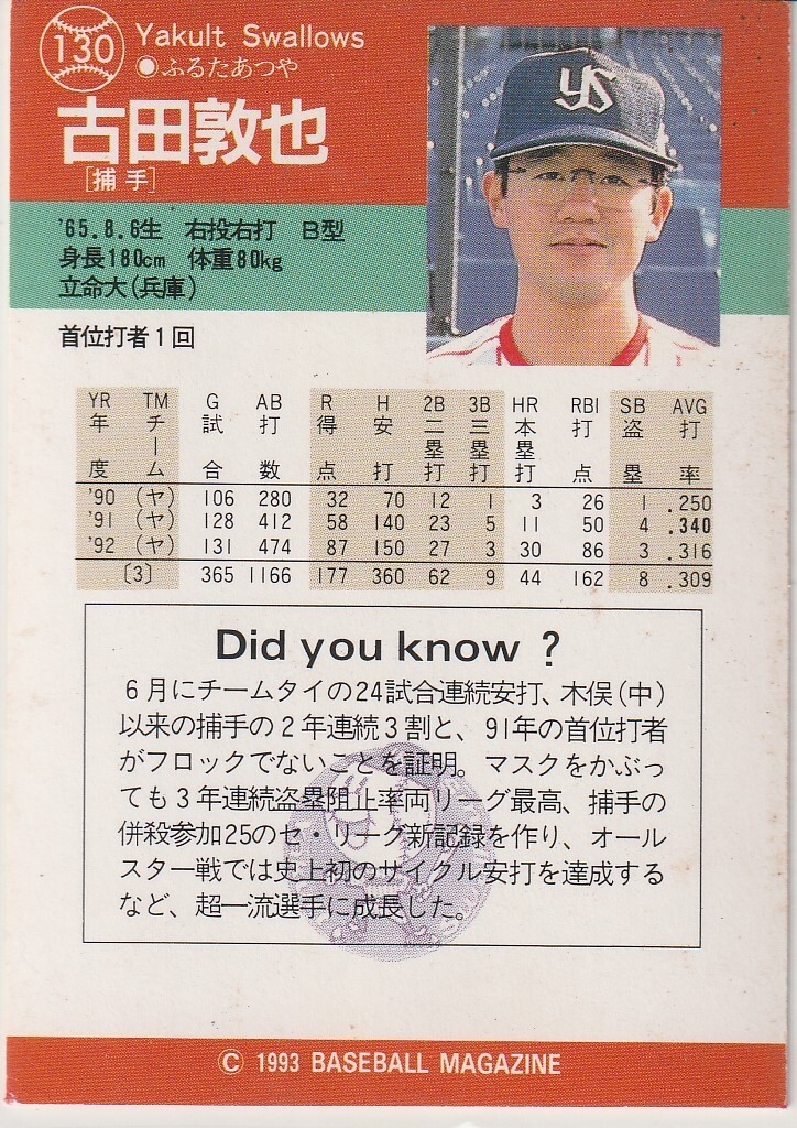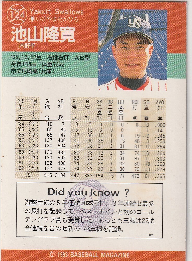 ●1993BBM【池山 隆寛、古田 敦也】BASEBALL CARD 2種 No.124,130:ヤクルト