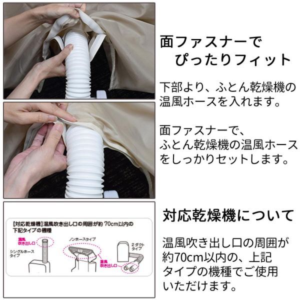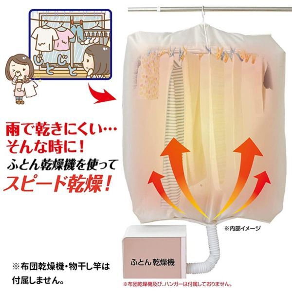 お手持ちの角ハンガーなどに本品をかぶせ、布団乾燥機の温風を袋の中に送り込んで衣類を乾かします。