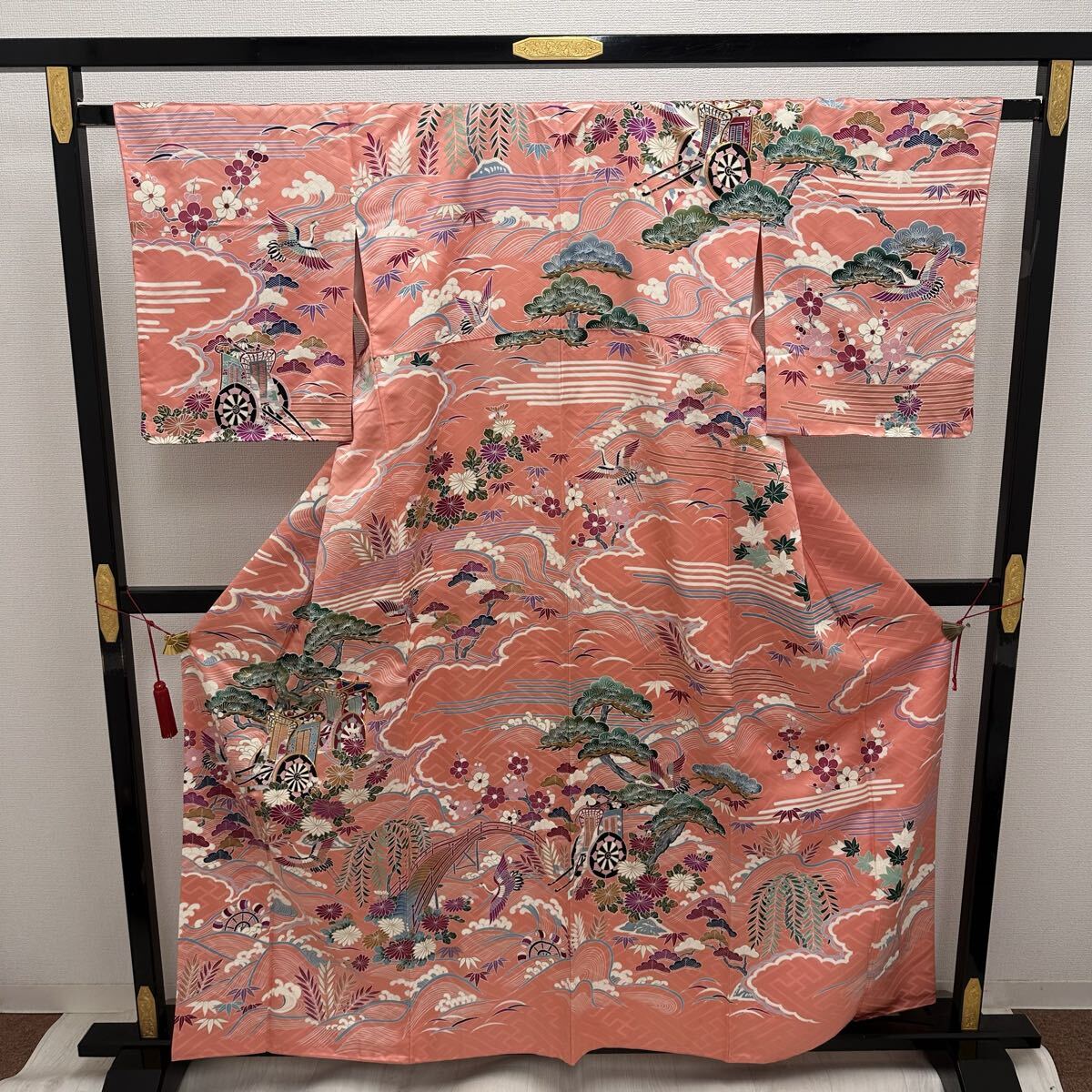 やまと誂え 付下げ 御所車に花模様 流水に松 金駒刺繍 着物 正絹 Q-180