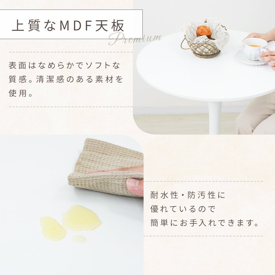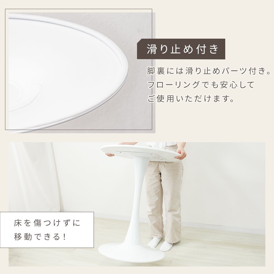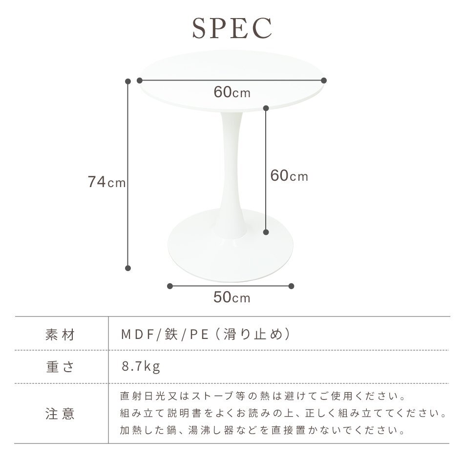 シンプルな形が美しい丸型ダイニングテーブル! シンプルだからこそ、どんなお部屋にも馴染みます。 ワンルームにもオススメ! お家にいながらおしゃれなカフェにいるかのような贅沢な時間を味わうことができます♪ 一本脚なので足元のスペースが広々。リラックスした姿勢で過ごせます。 耐久性にも優れ、頑丈なスチール脚はしっかりとテーブルを支えます。 脚裏には、滑り止めパーツ付き。床を傷つけることなく移動できます。 組立簡単!女性一人でも簡単に組み立てられます♪ 【商品仕様】 ・カラー:ホワイト ・サイズ:(約)直径60×高さ74cm ・重量:(約)8.7kg ・耐荷重:(約)130kg ・素材:MDF/鉄/PE(滑り止め) 【注意事項】 ・直射日光又はストーブ等の熱は避けてご使用ください。 ・組立て説明書をよくお読みの上、正しく組立ててください。 ・加熱した鍋、湯沸かし器などを直接置かないでください。 |