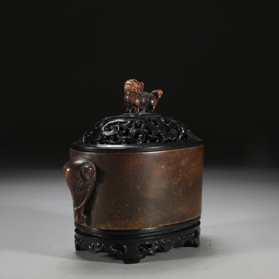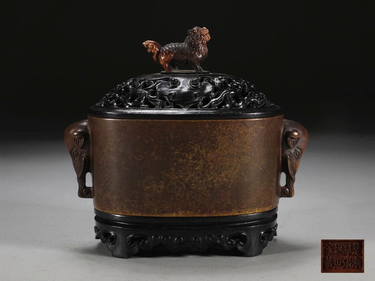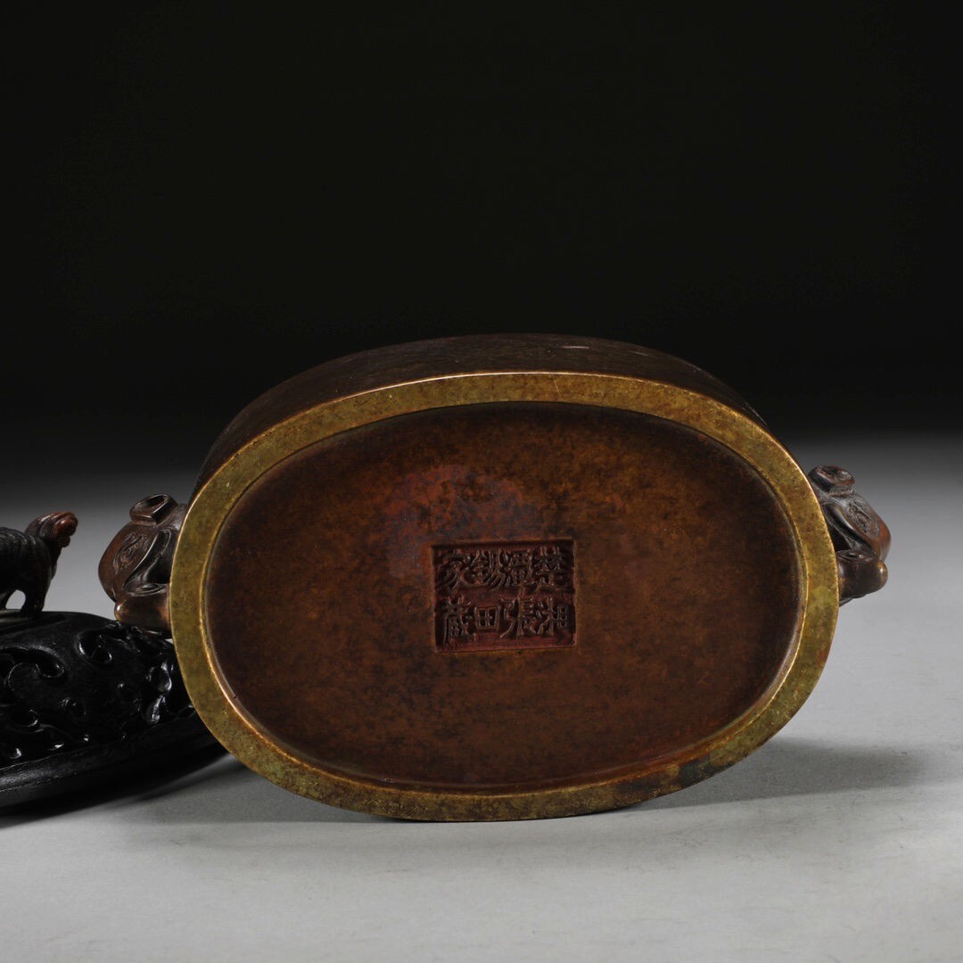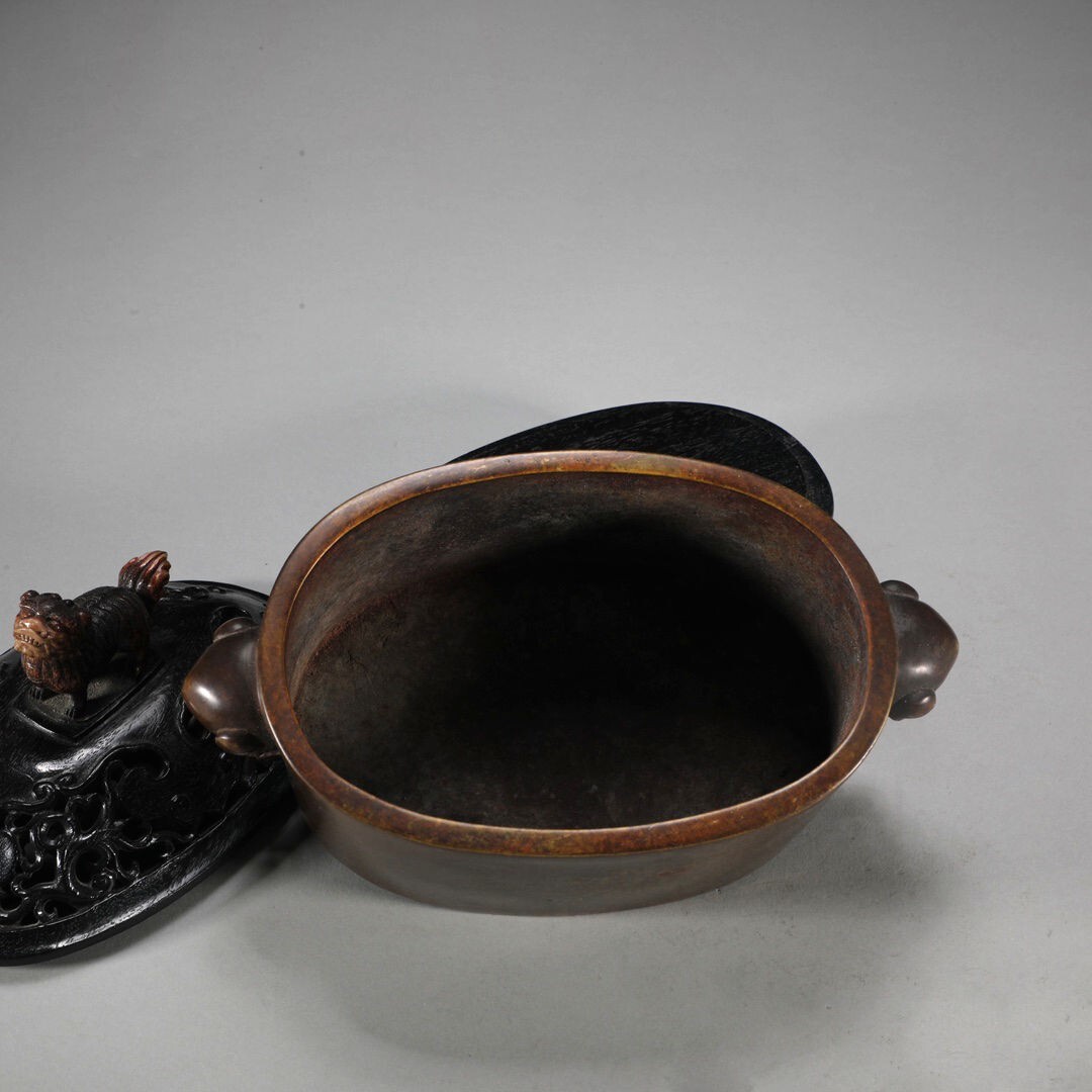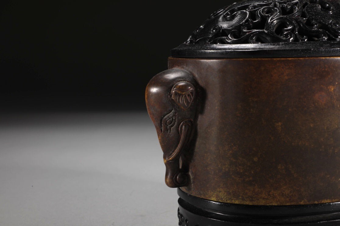 「清代 楚湘潭張錫田家藏 古銅彫 象首耳 墾式老銅香薰炉」旧銅器 置物擺件 賞物 中国古美術 旧蔵出