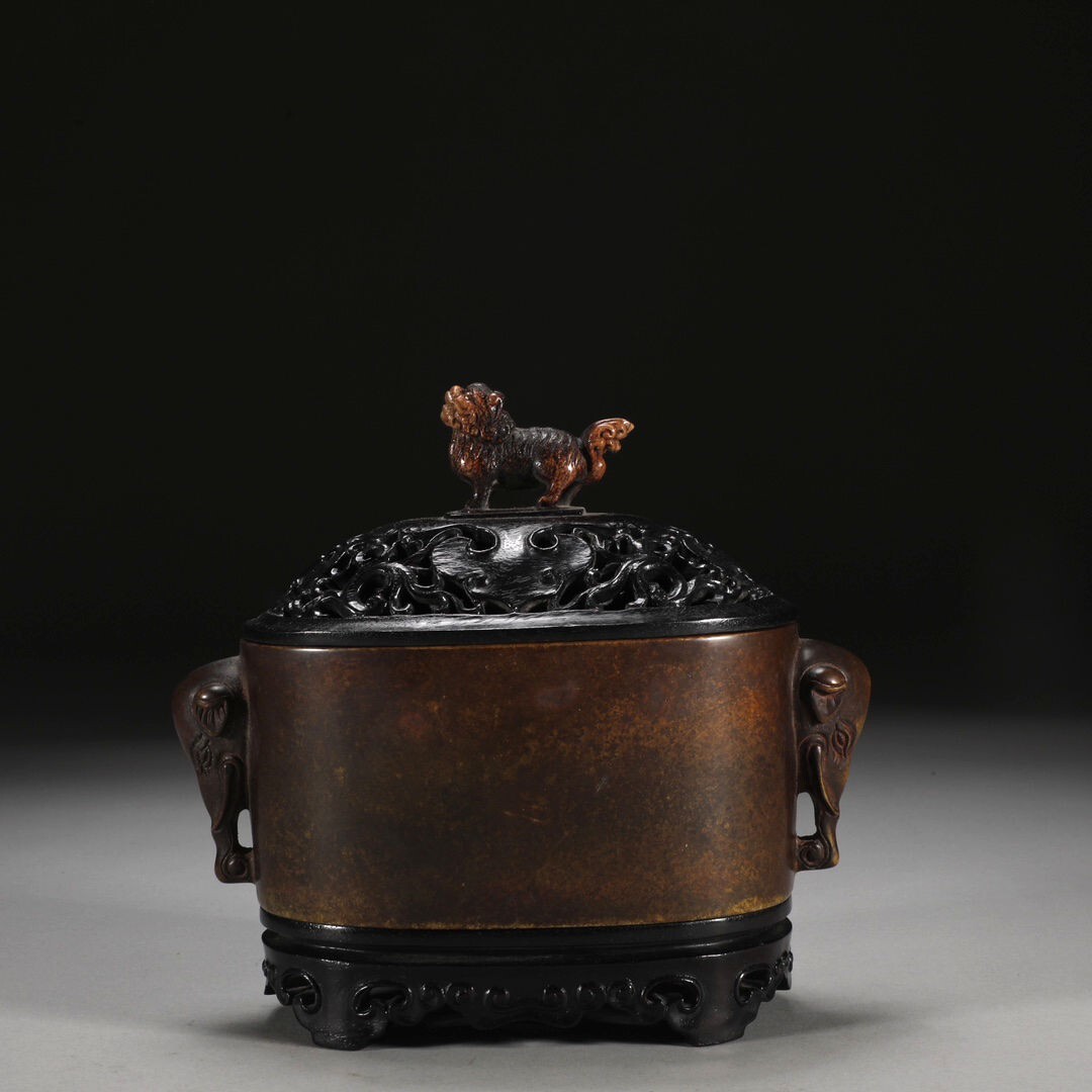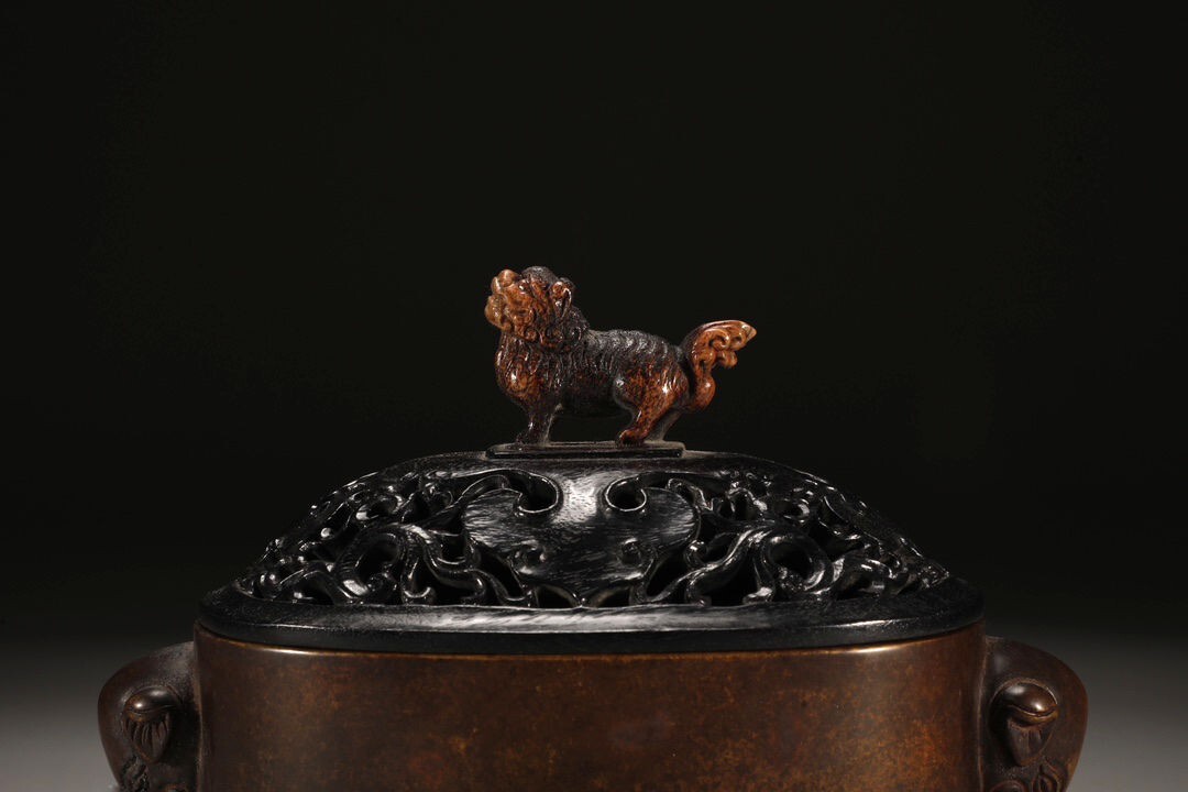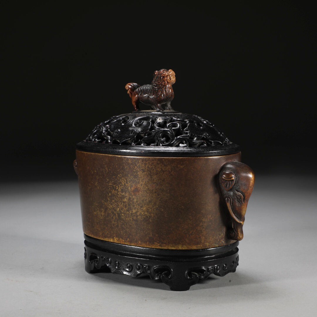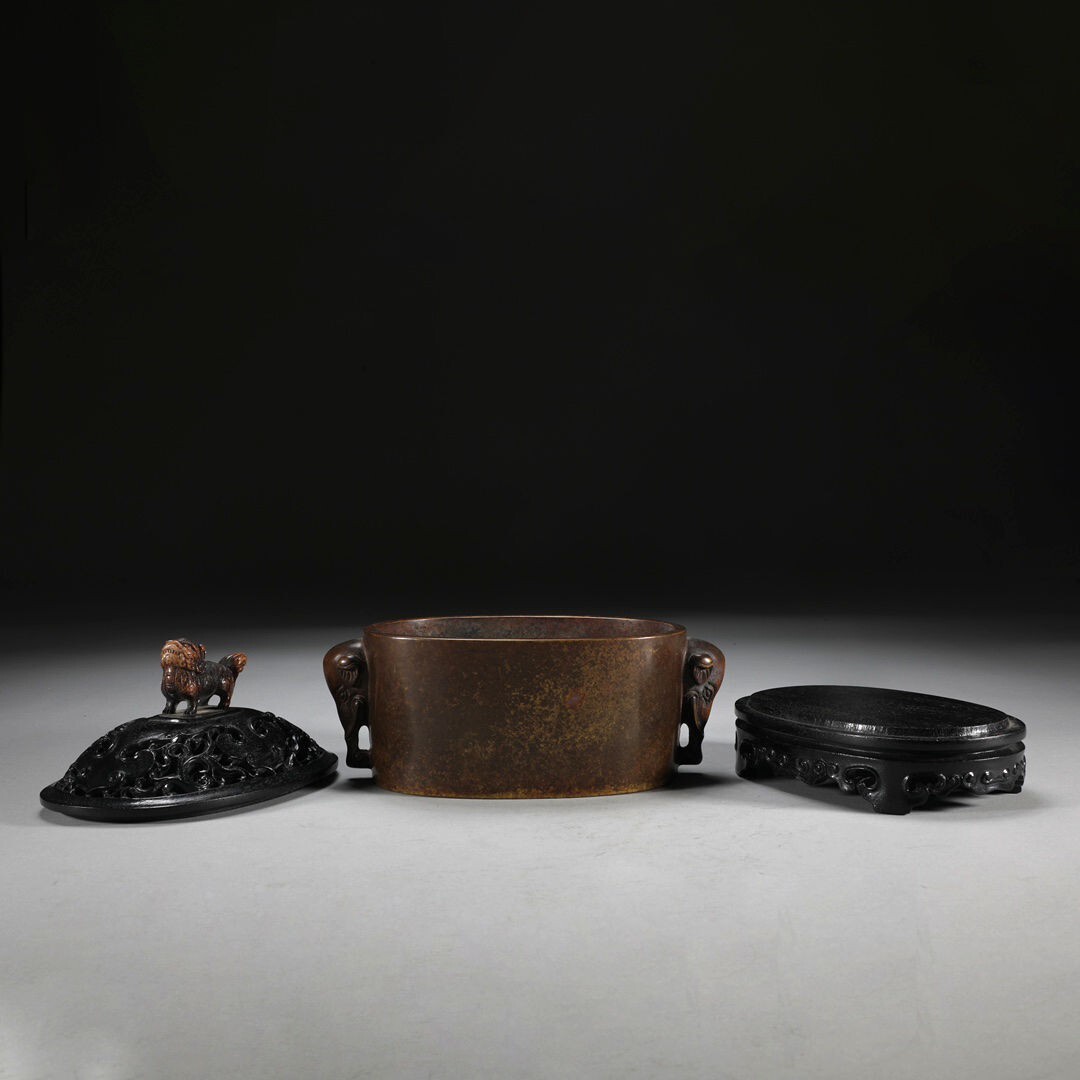 「清代 楚湘潭張錫田家藏 古銅彫 象首耳 墾式老銅香薰炉」旧銅器 置物擺件 賞物 中国古美術 旧蔵出
