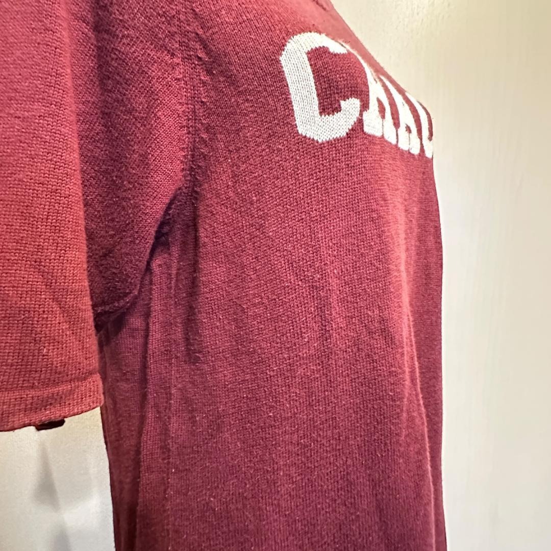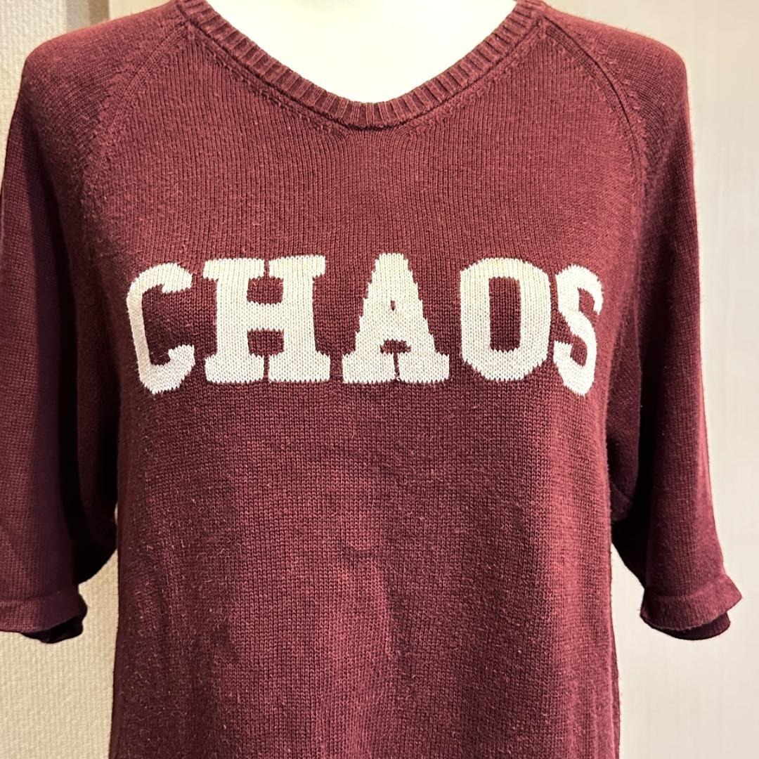 深みのあるボルドーカラーのボディに、フロントへ大胆に配置された「CHAOS」ロゴが印象的なデザインです。柔らかく編まれたコットンニット素材で、カットソー感覚で着用可能。