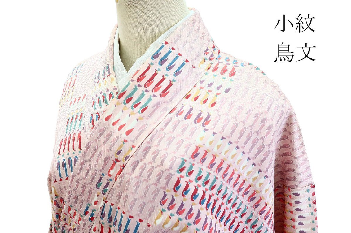【送料無料】珍柄! 未使用品 小紋 桜色 鳥文 身丈160.5cm 裄丈67cm お洒落 カジュアル 仕立て上がり 正絹 着物フィ m-8391 |