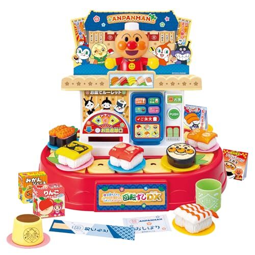 「お皿をいれてルーレットにぎってアンパンマン 回転ずしDX」▼4975201182663▼(商品説明)レッド/-/182663・スマートタッチパネルで注文、くるくる回るアンパンマンの回転ずし・食べ終わったお皿を返却口に入れるとルーレット遊びが楽しめるよ・おすしはネタとシャリを面ファスナーでくっつけたり、はずしたりできます。スマートタッチパネルで注文、くるくる回るアンパンマンの回転ずし 食べ終わったお皿を返却口に入れるとルーレット遊びが楽しめるよ 後ろの棚におすしのネタやシャリを置いて、おすしをにぎろう おすしはネタとシャリを面ファスナーでくっつけたり、はずしたりできます。 作ったおすしはお皿に乗せレーンに置こう スマートタッチパネルは5つのボタンでアクションを選べます。 回転ボタンを押すとアンパンマンがおしゃべりして、レーンが回転し、もう1度押すと止まります。 メロディボタンは押すごとに曲が順番に再生されます。 「アンパンマンのマーチ」と童謡の4曲が流れます。 よびだしボタンを押すと「ピンポーン」と音がしてアンパンマンがおしゃべりします。 ご注文ボタンを押すと「ピッ」と音が鳴りばいきんまんとドキンちゃんが注文してくれます。 お会計ボタンを押すとアンパンマンがおしゃべりして、お寿司屋さんごっこを盛り上げます。 お茶コーナーはボタンを押すと「コポコポコポ」とお茶をいれる音がしてアンパンマンがおしゃべりします。 食べ終わったらお皿でルーレット 返却口にお皿を入れると音が鳴り、ルーレットの光が点滅してアンパンマンたちがおしゃべりします。 光が真ん中に止まったら当たり お皿は返却口の反対側から出てきます。 紙の小物やお皿は後ろのたなにスッキリお片付けできます。 アンパンマンたちがデザインされたかわいいおすしがいっぱい おすし作りができるまぐろ、サーモン、たまご、いくら、えびの5種類のにぎり寿司と、アンパンマンのお顔型の太巻きがついています。 その他にデザートのプリンやジュース、湯のみ、お皿8枚を付属。 たくさん注文しちゃおう