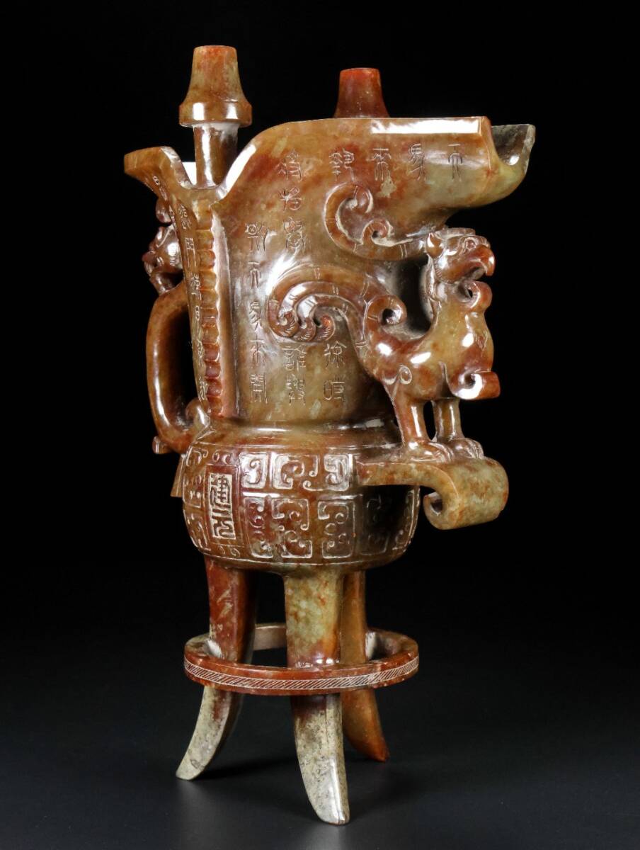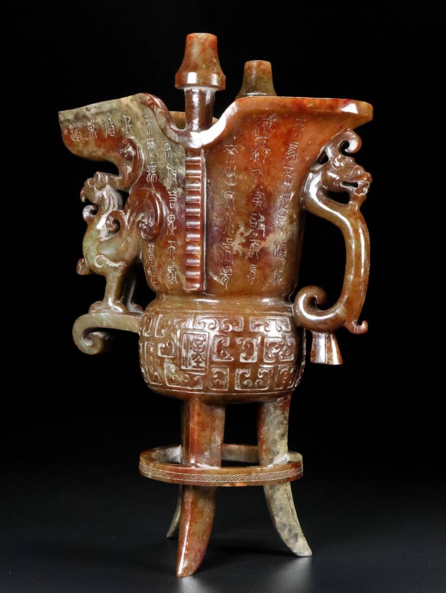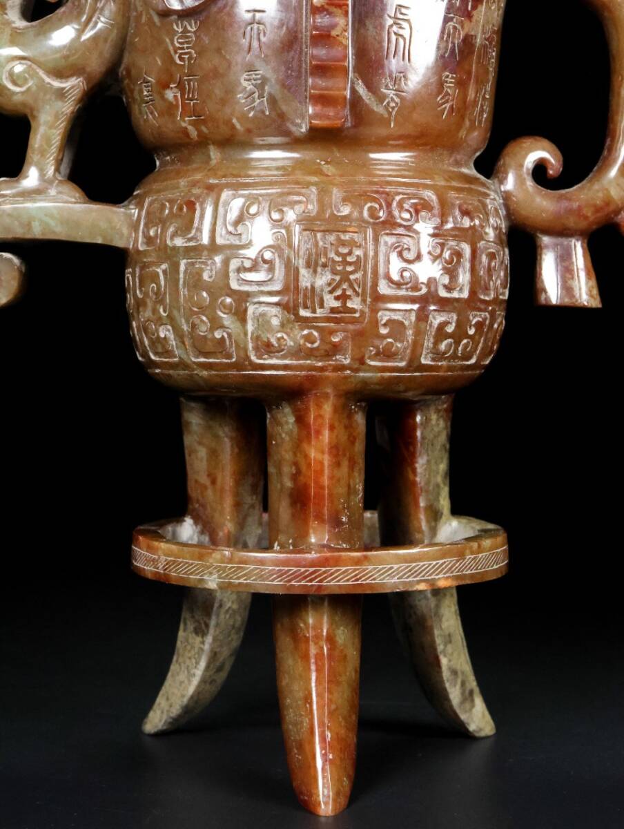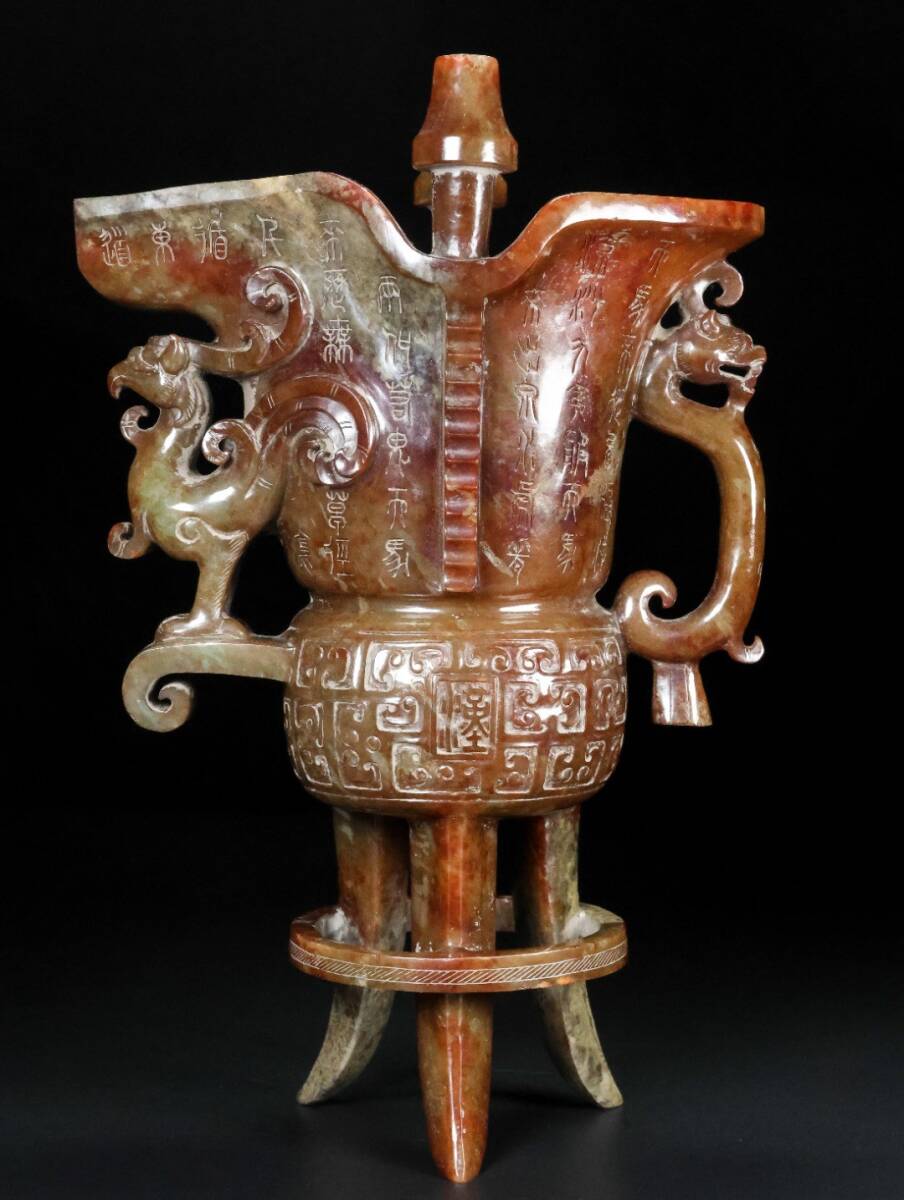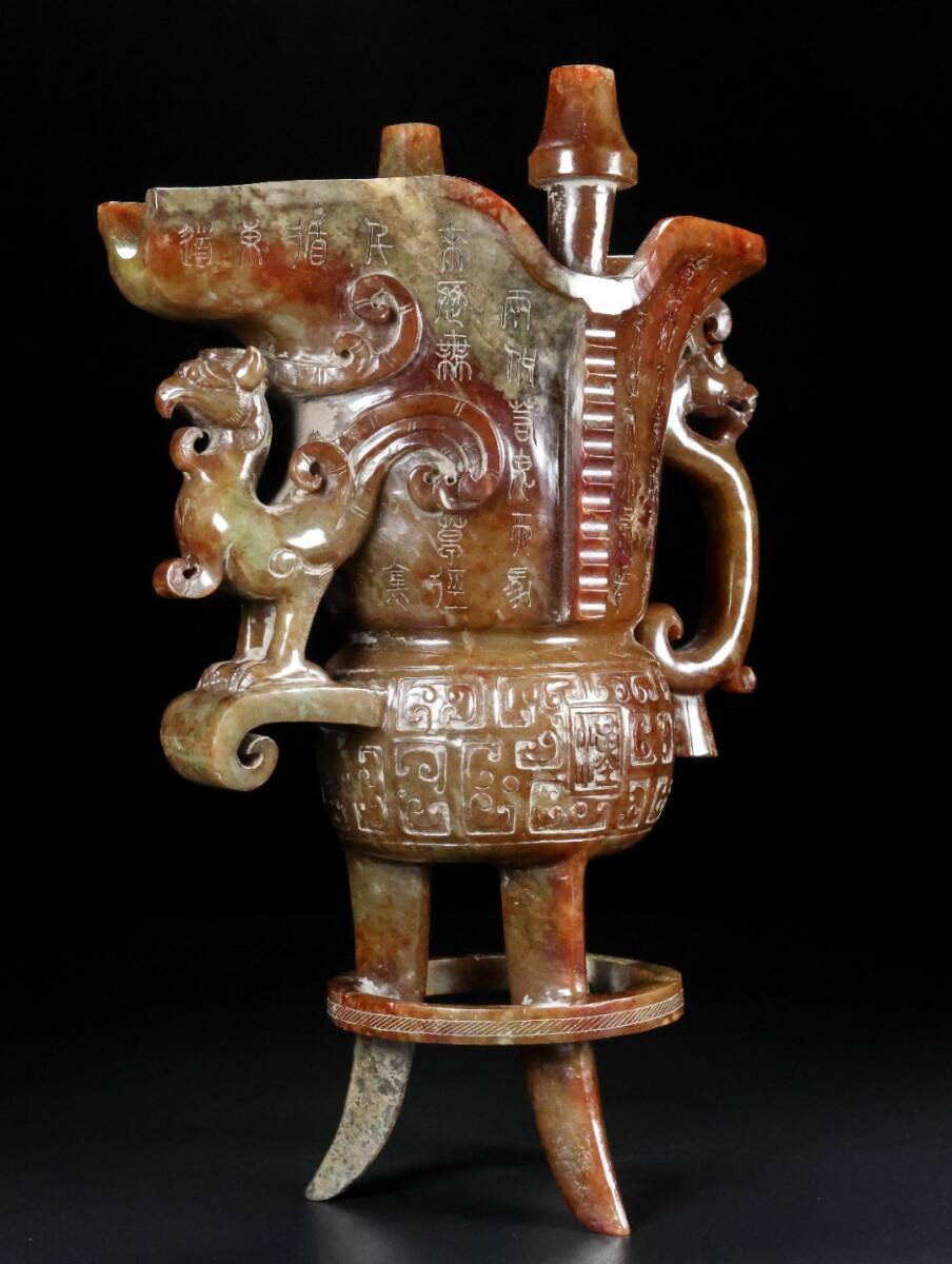 【永】漢代時期 和田玉 古玉彫 高古玉 三足鳳耳 酒器 玉杯 極細工 置物擺件 古美術品 古董品 収集 古美味 骨董品 旧家蔵出 中国唐物 1247g