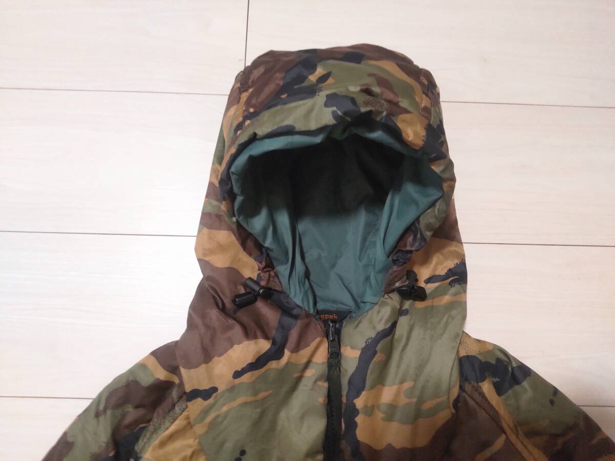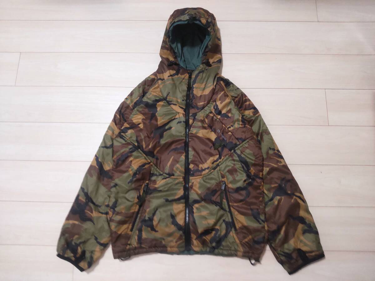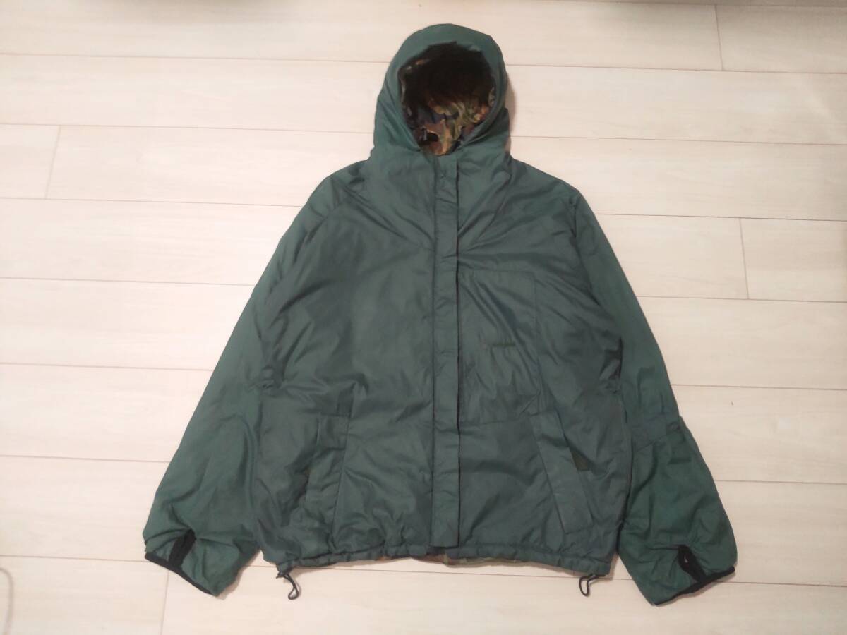 イギリス、Snugpak(スナッグパック)社のインサレーションジャケットです シュラフや防寒クロージングを作っている歴史のあるブランドです ■サイズはSになります 素人採寸ですが 身幅(脇の下で)59cm 着丈(背面側で)70cm 裄丈87cmありました ■イギリス製です ■リバーシブルとなっております ■片面はカモフラージュ柄となっております ■もう片側は落ち着いたグリーン系のカラーです 全体的にミリタリーテイストのあるデザインとなっております ■生地はナイロンです ■素材にはPERTEX(バーテックス)を使用しております ■中綿が入っております ただ申し訳ございませんが中綿の種類は分かりません またダウンではありませんのでよろしくお願いします ■ポケットはそれそれの面に左右それぞれと左胸に付いております ■裾とフードはドローコードで締めることが出来ます また片側の腕にもドローコードが付いております ■ユーズドになりますので使用感が全体的にあります またいくつか特筆すべき点があります 1.グリーン面全体に色あせや汚れがあります(色あせはむらがあります)またポケット付近にテカリがあります(写真8.10枚目をご参照下さい)2.正面ジッパー下部左右を合われる箇所付近に1cmほどのほつれがあります またベルクロに破れがあります(写真9枚目をご参照下さい)ジッパーは動きます 3.袖口のゴムが伸びております(写真6枚目をご参照下さい)■スナッグパックのファンの方いかがでしょうか 是非よろしくお願い致します