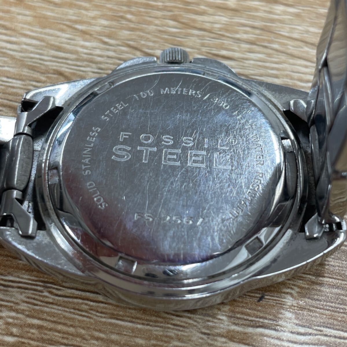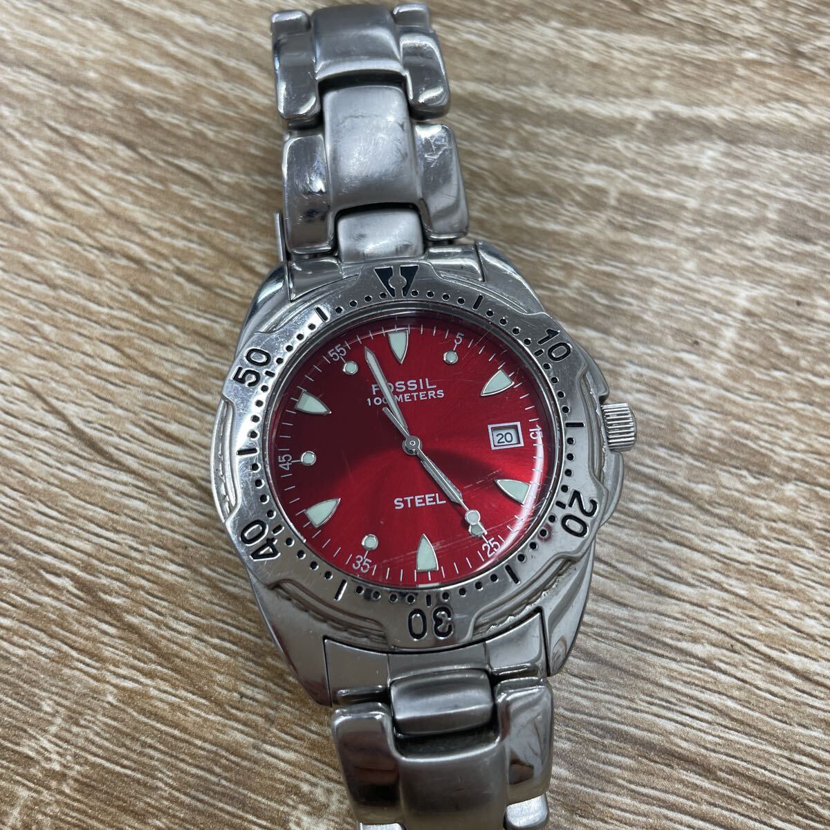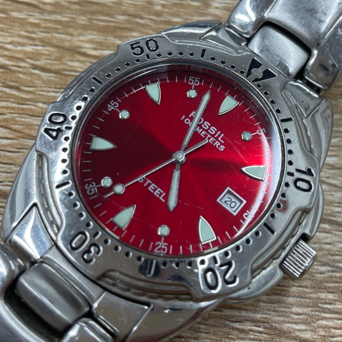 FOSSIL フォッシル FS-2567 腕時計 アナログ カレンダー レッド文字盤 メタルバンド シルバー ラウンド ステンレススチール 稼働品