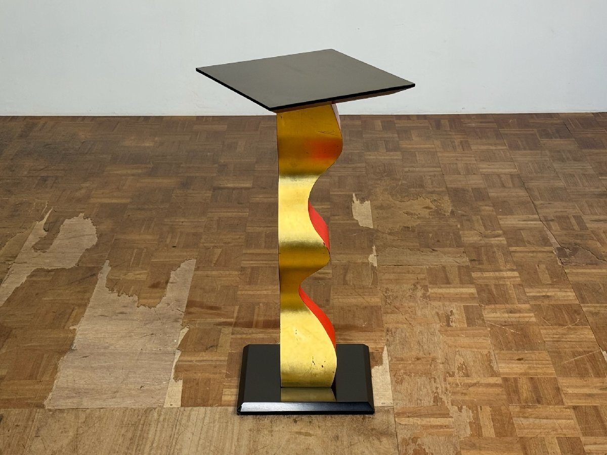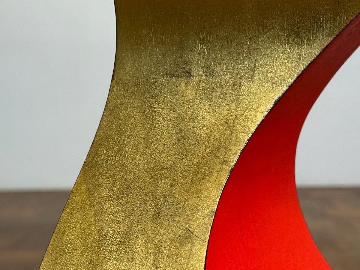 ポストモダニズムらしいビビッドレッドと漆や金箔のようなマットなイエローゴールドに、グロッシーブラックを合わせたマッシブなカラーコントラストに、大胆に支柱を立てた立体造形の斬新な形状美で Post-Modernism / ポストモダニズム猛々しいアイキャッチなデザインに構成された、オーナメントマルチサイドテーブルラック。イタリア1970sヴィンテージ品のご提案。