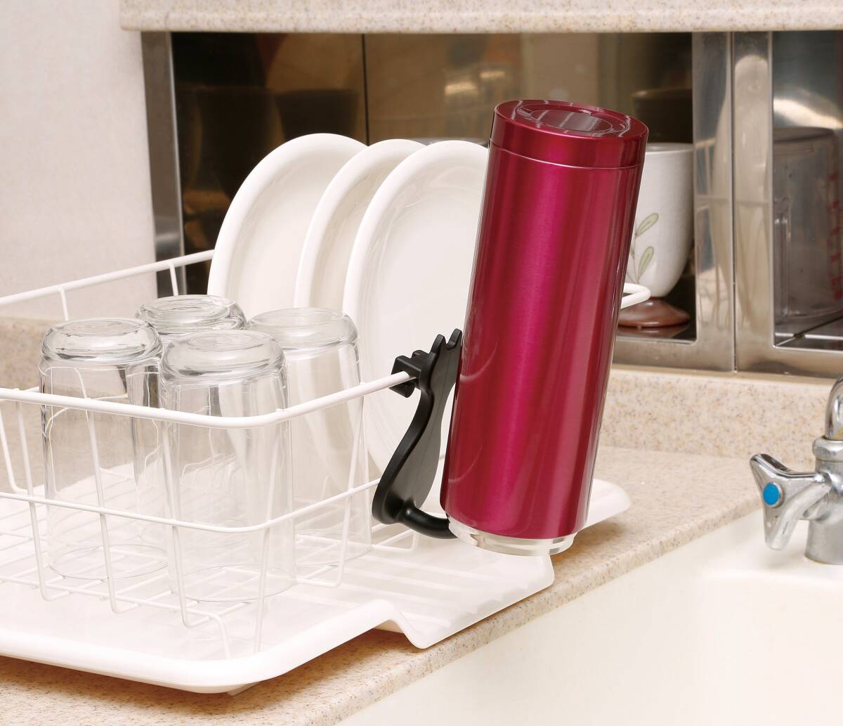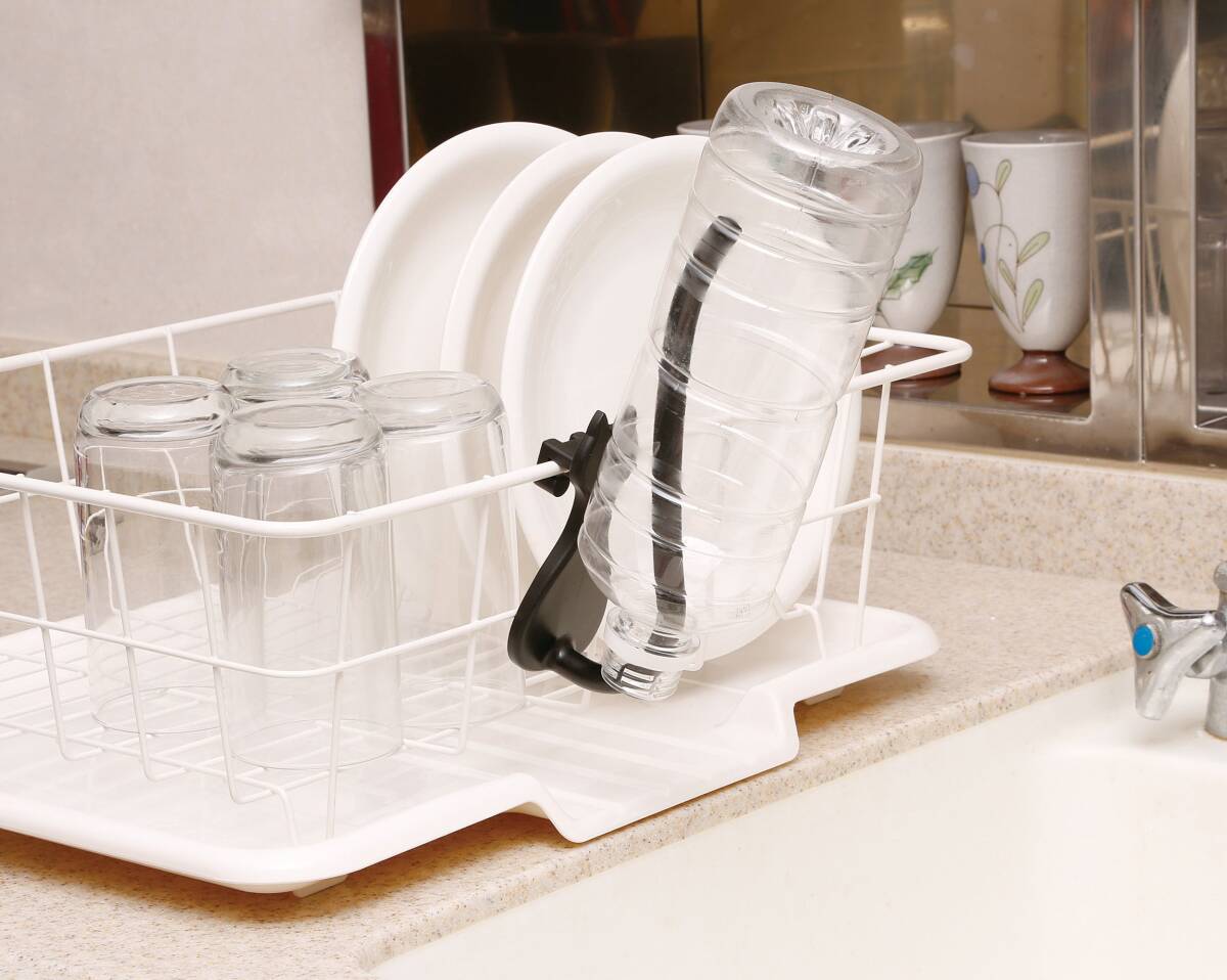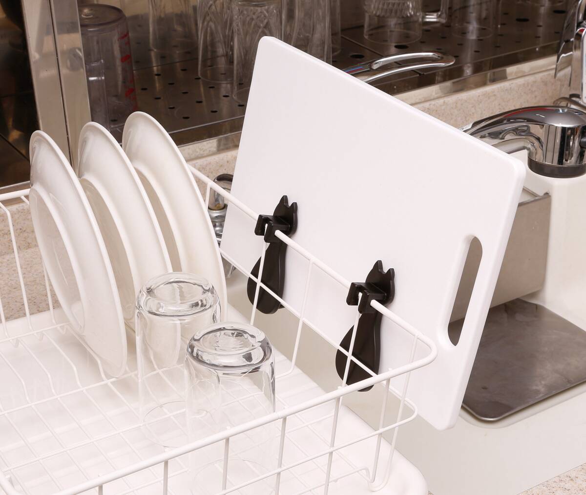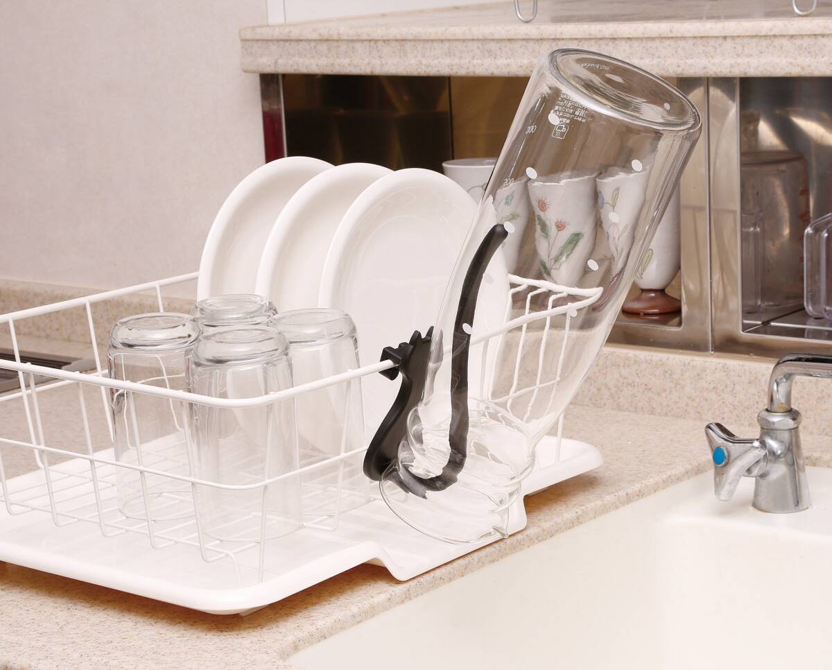 ●取り付けているだけでかわいいネコ型のボトル掛けです ●取り付け簡単、水切りカゴに引っ掛けるだけ ●かさばるマグボトルやペットボトルをカゴの外に干せて便利です ●2つ使用でまな板やタッパーなども干せる