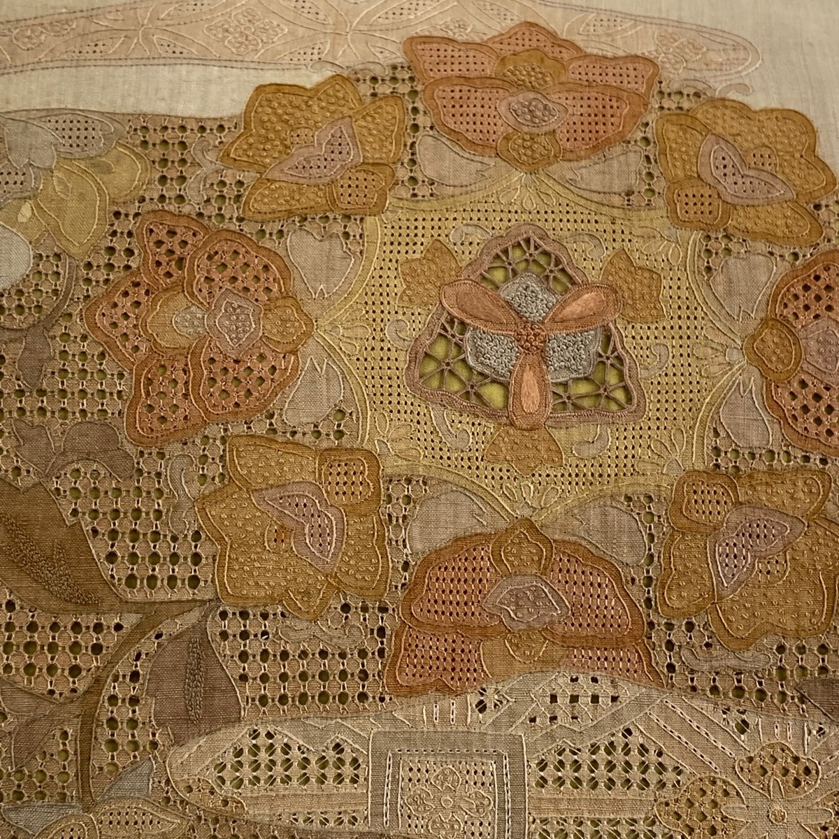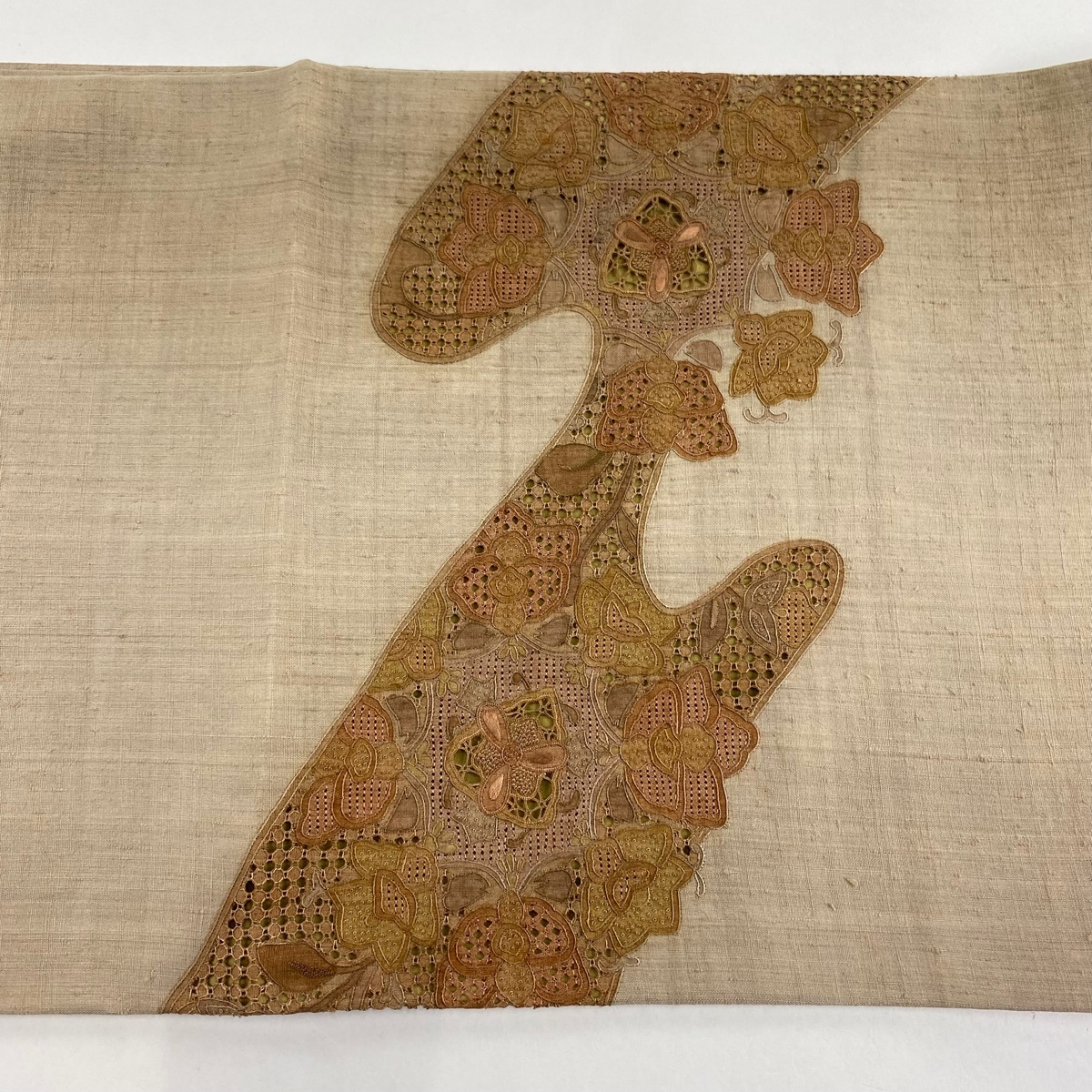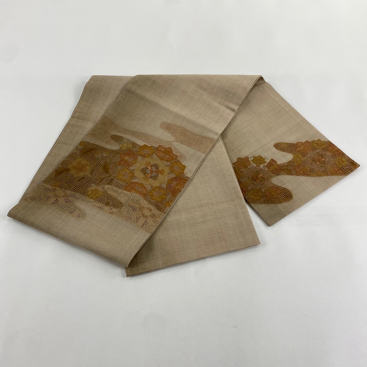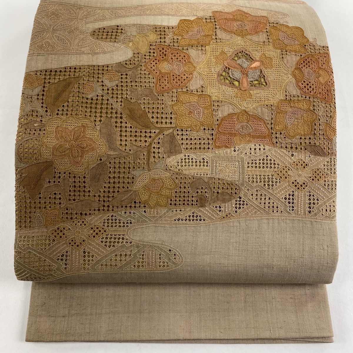 | 袋帯 美品 秀品 紬地 華文 草花 刺繍 灰茶 お太鼓柄 正絹 【中古】 |
