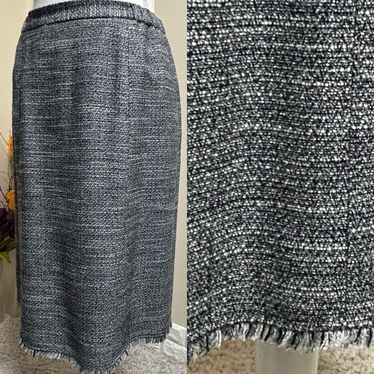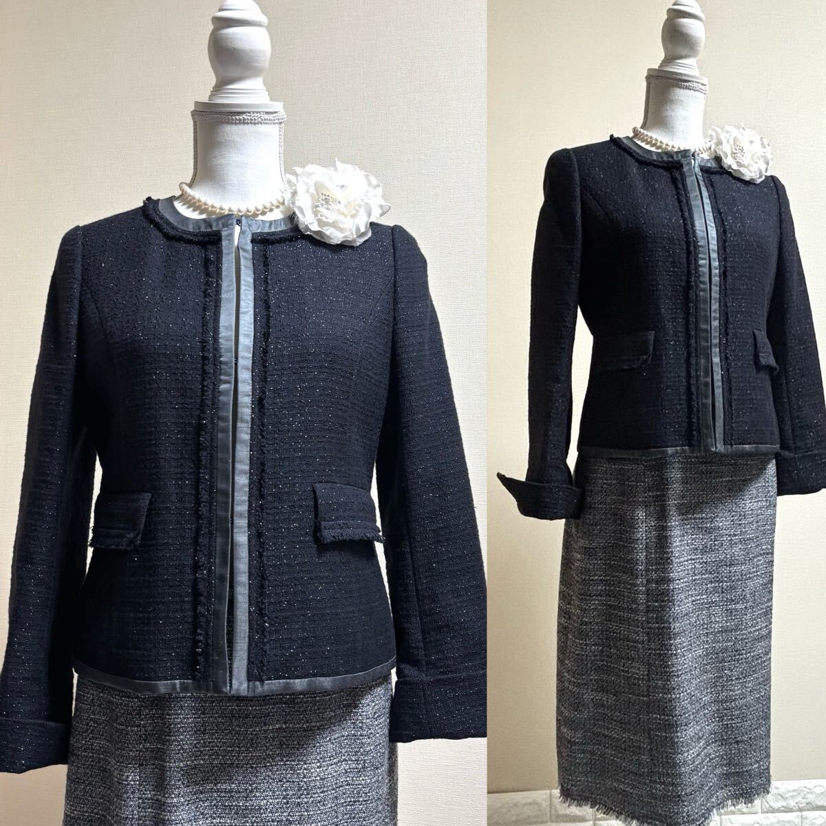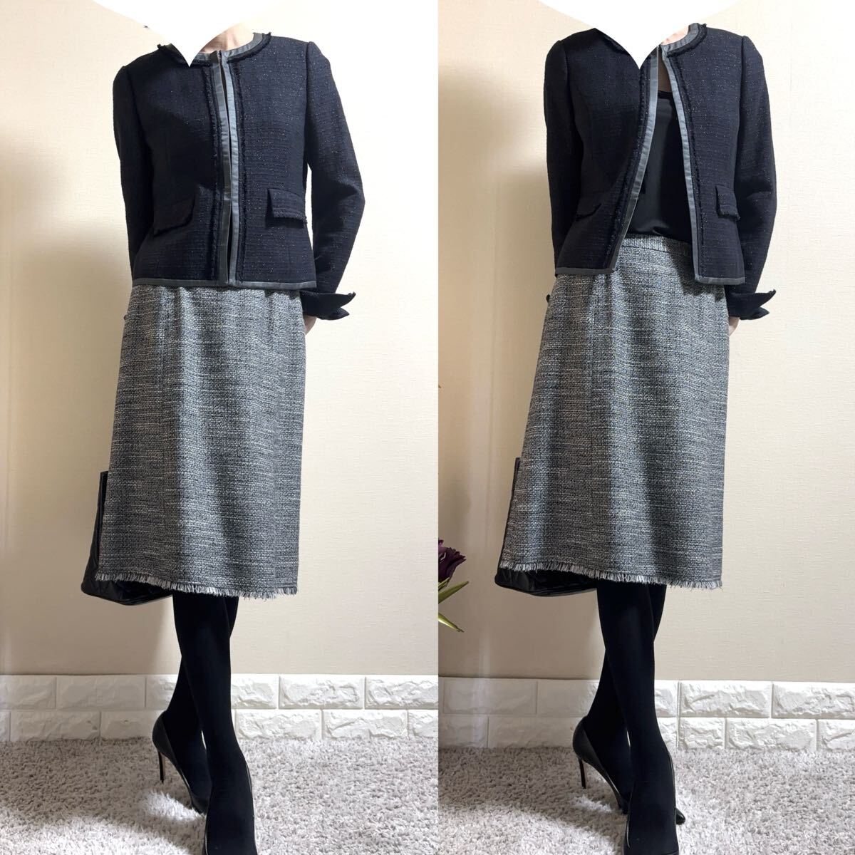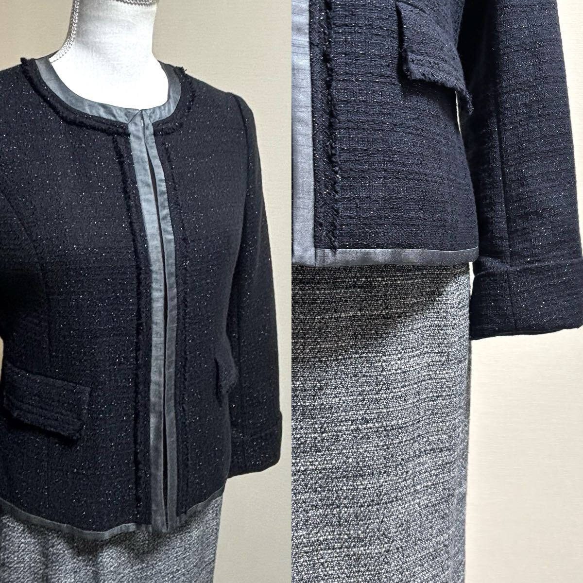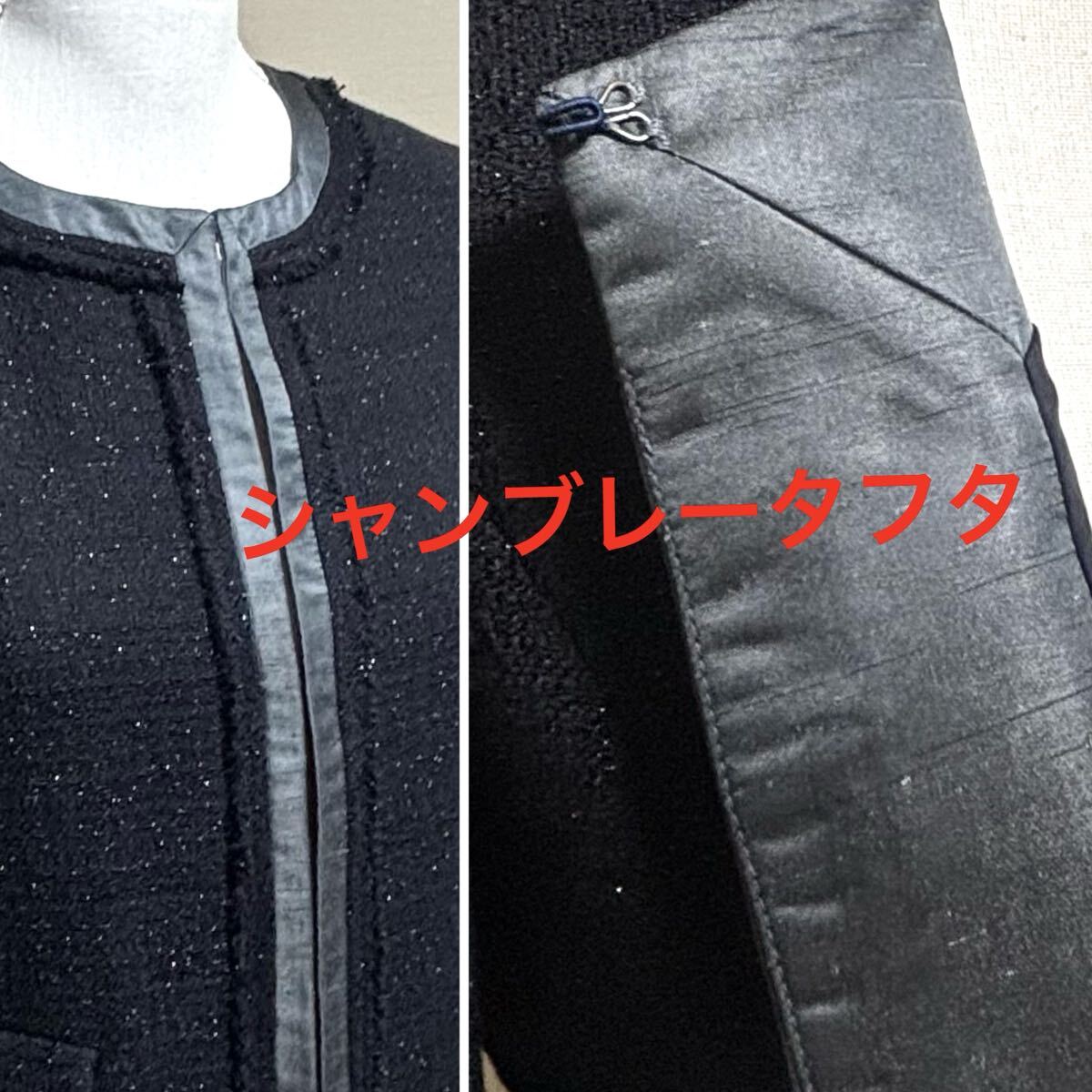 品良くシルバーラメがきらめく濃紺ツイードにブルーグレーのシャンブレータフタパイピングデザイン。