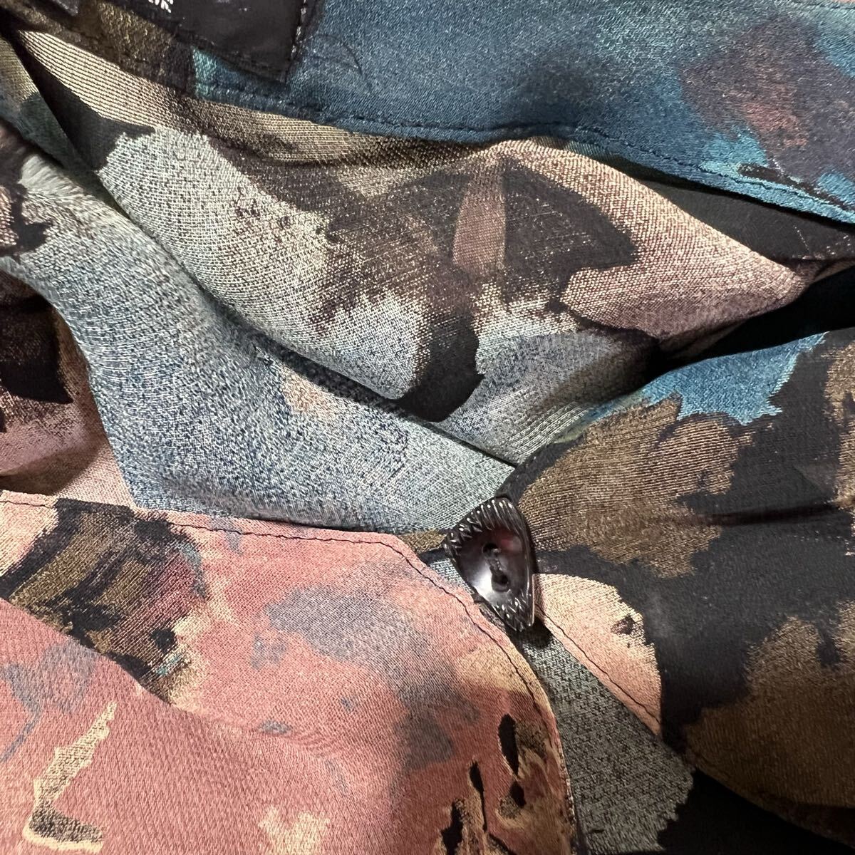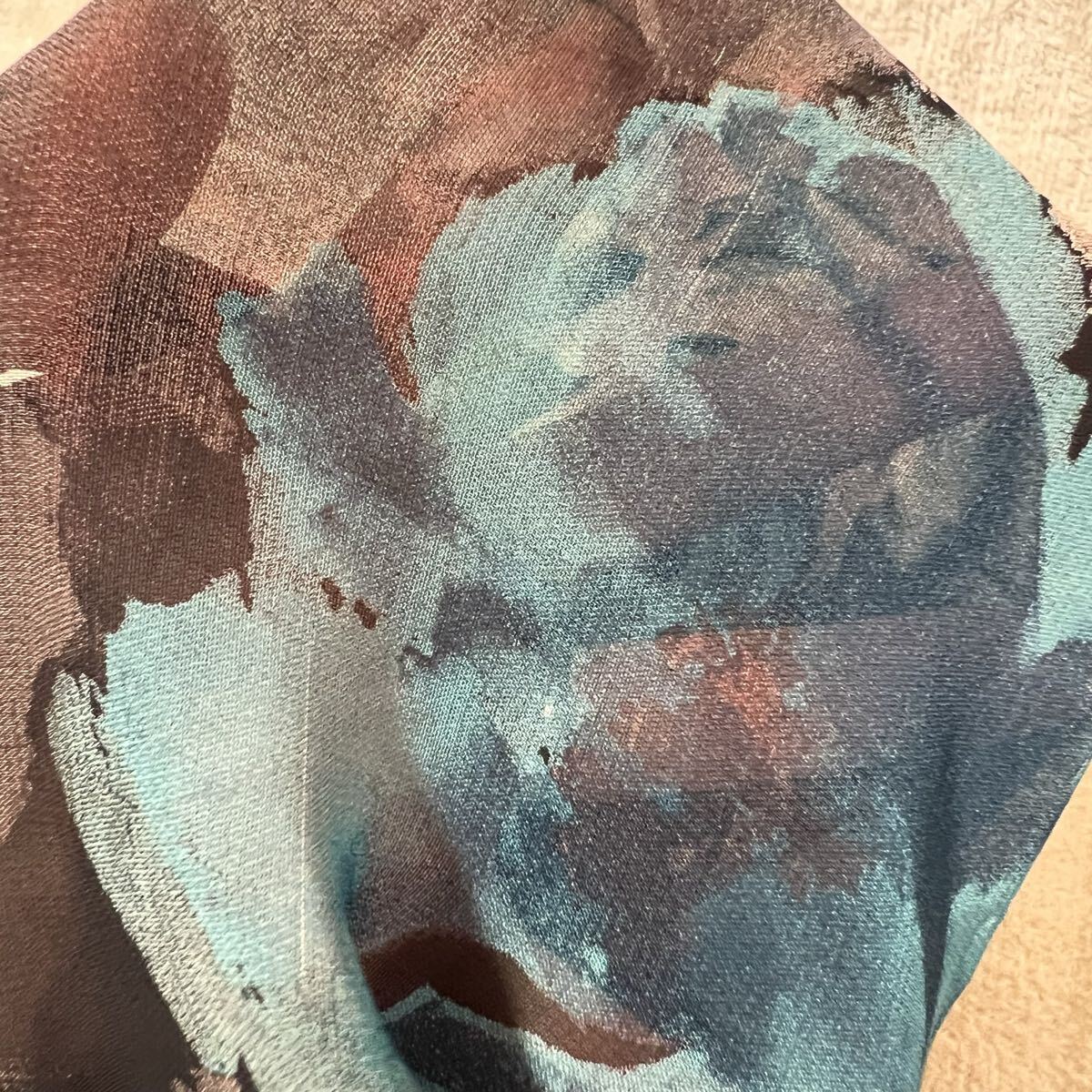 柄: 抽象的なタッチの大きな花柄。濃い地色に、青、水色、ピンク、茶色、ベージュなどの色が組み合わされた柄行きです。