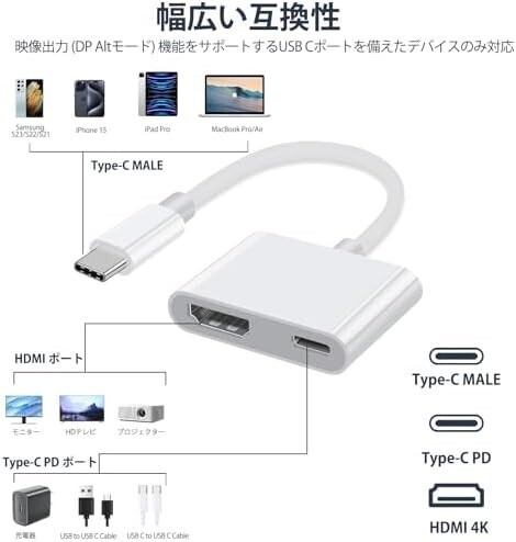 【幅広い互換性】Typec - HDMIアダプタは、DisplayPort代替モードをサポートするUSB-Cポートを備えたデバイスと互換性があります。iPhone 15シリーズiPhone16シリーズ/MacBookPro/MacBookAir/iPadPro/iPadAir/GalaxyS23シリーズ/GalaxyS22シリーズGalaxyS21/S20/Note20およびその他のUSB-Cデバイスと互換性があります。 その他のUSB Type Cデバイス。 「1.Sony Xperia (XperiaAceシリーズは非対応)とSharp AQUOS(senseシリーズは非対応)について、ほとんど非対応ため、ご注文前にぜひお問い合わせください。Sony Xperia 1 IV SO-51Cのコンテンツ保護で、ご購入することをお勧めいたしません。2.iPhone 16Eと (Lightning)に対応しません。3.不完全リストなので、購入前に商品紹介コンテンツの対応機種と不対応機種リストをご確認くださいませ。本製品は車載システムには使用できません。」