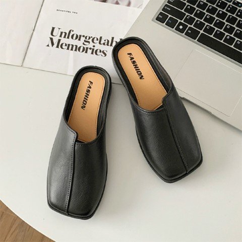 ・上品なセンターシーム風デザインのPVCスクエアトゥミュールサンダル。