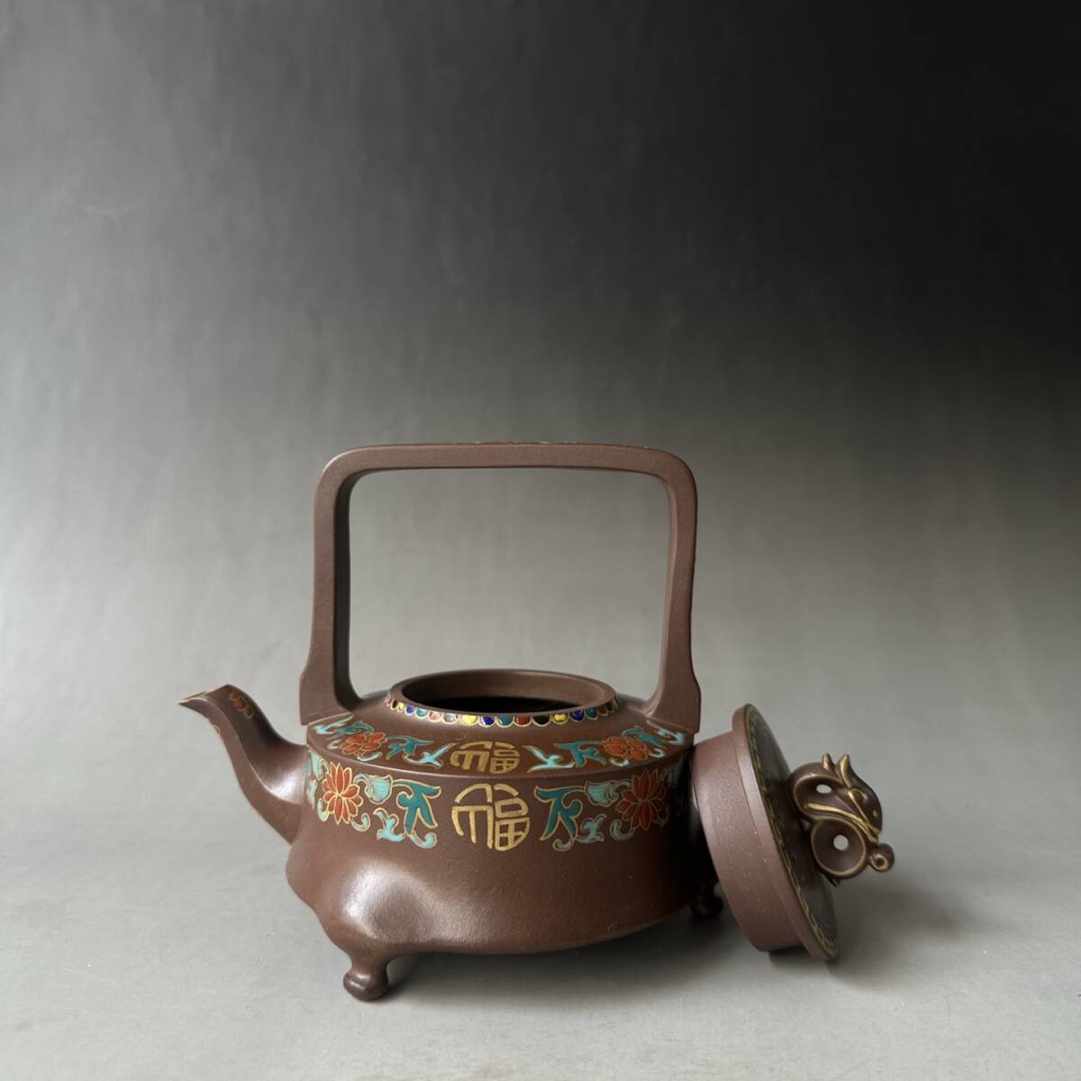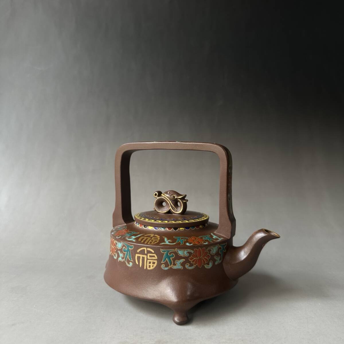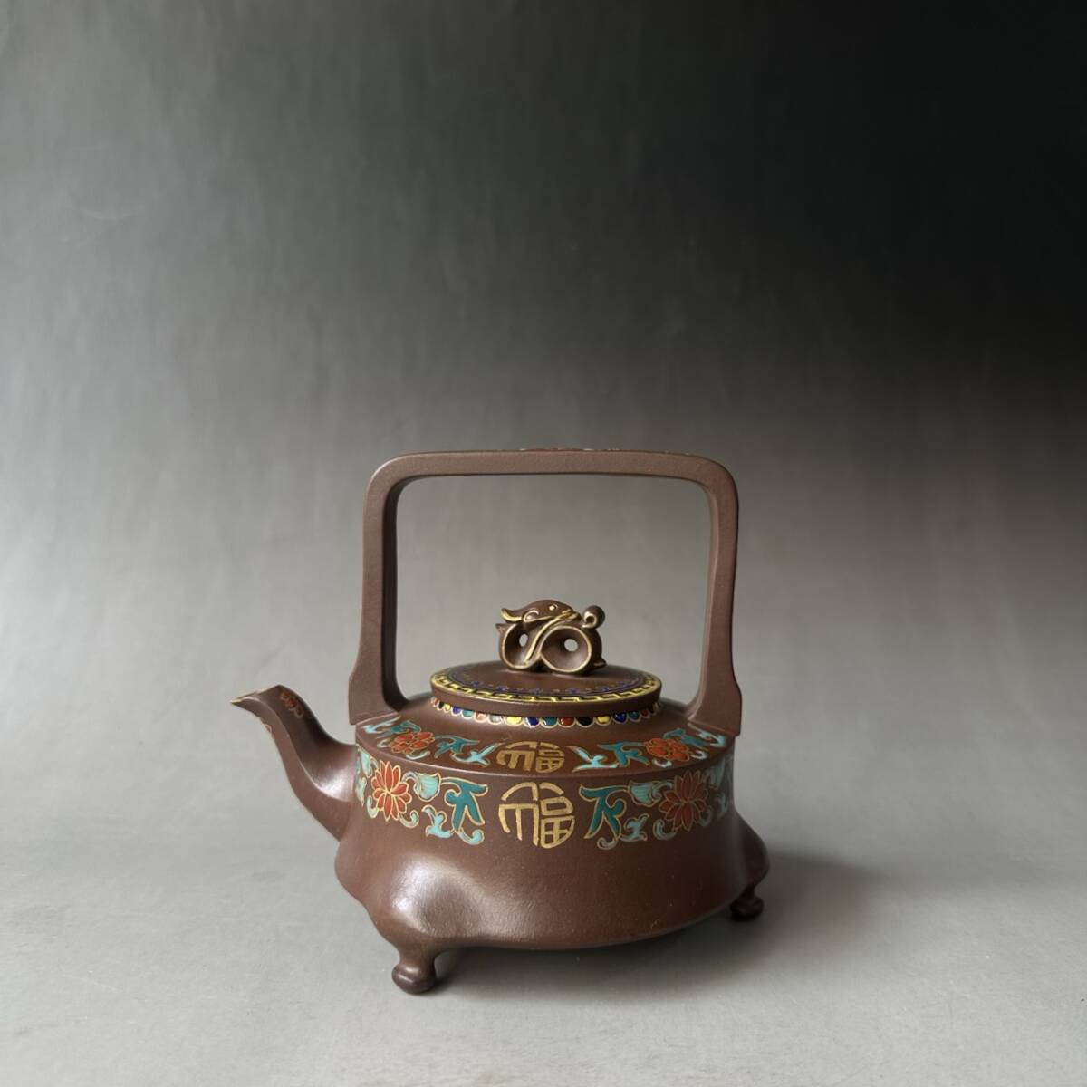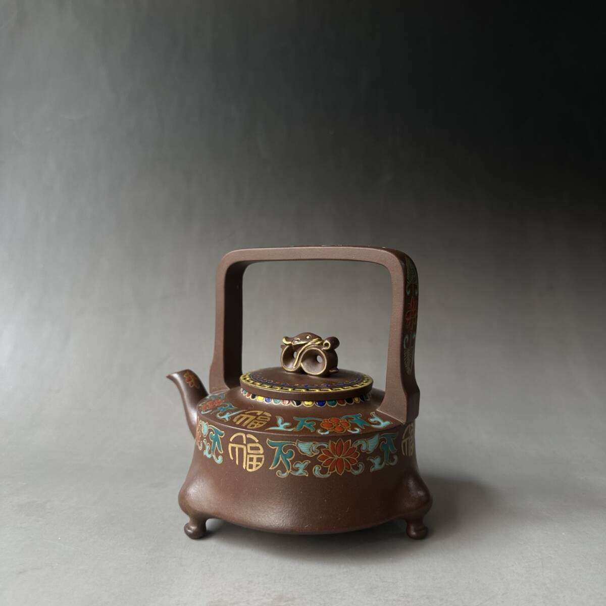 【超珍館蔵】紫砂壺 三足提梁壺 陳涛手製款 紫砂 茶具 茶道品 置物 賞物 古賞物 古董品 古美術品 時代物 旧家蔵出 稀少珍蔵品