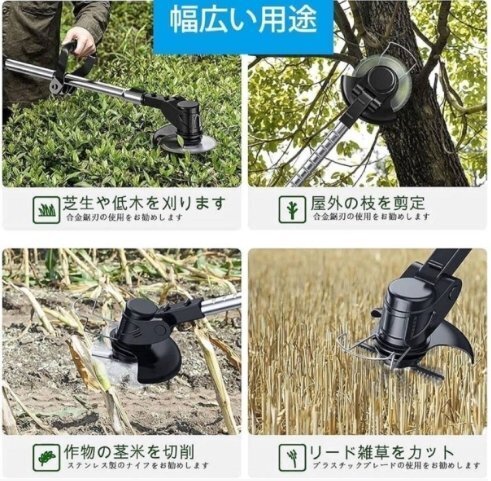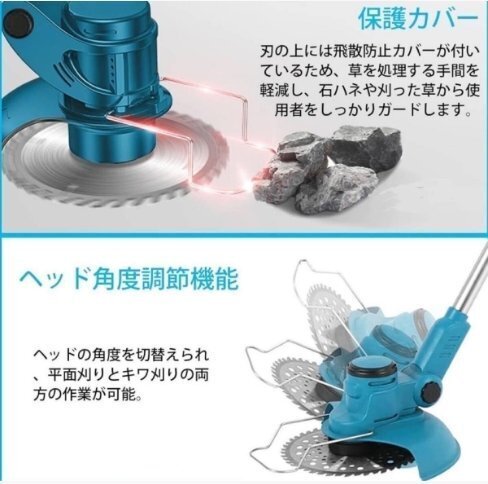 草刈り機 充電式 草刈機 電動草刈機 バッテリー2個 替刃8枚付 21Vコードレス 多機能 電動刈払機 伸縮式 3種類替刃 軽量 芝刈り機