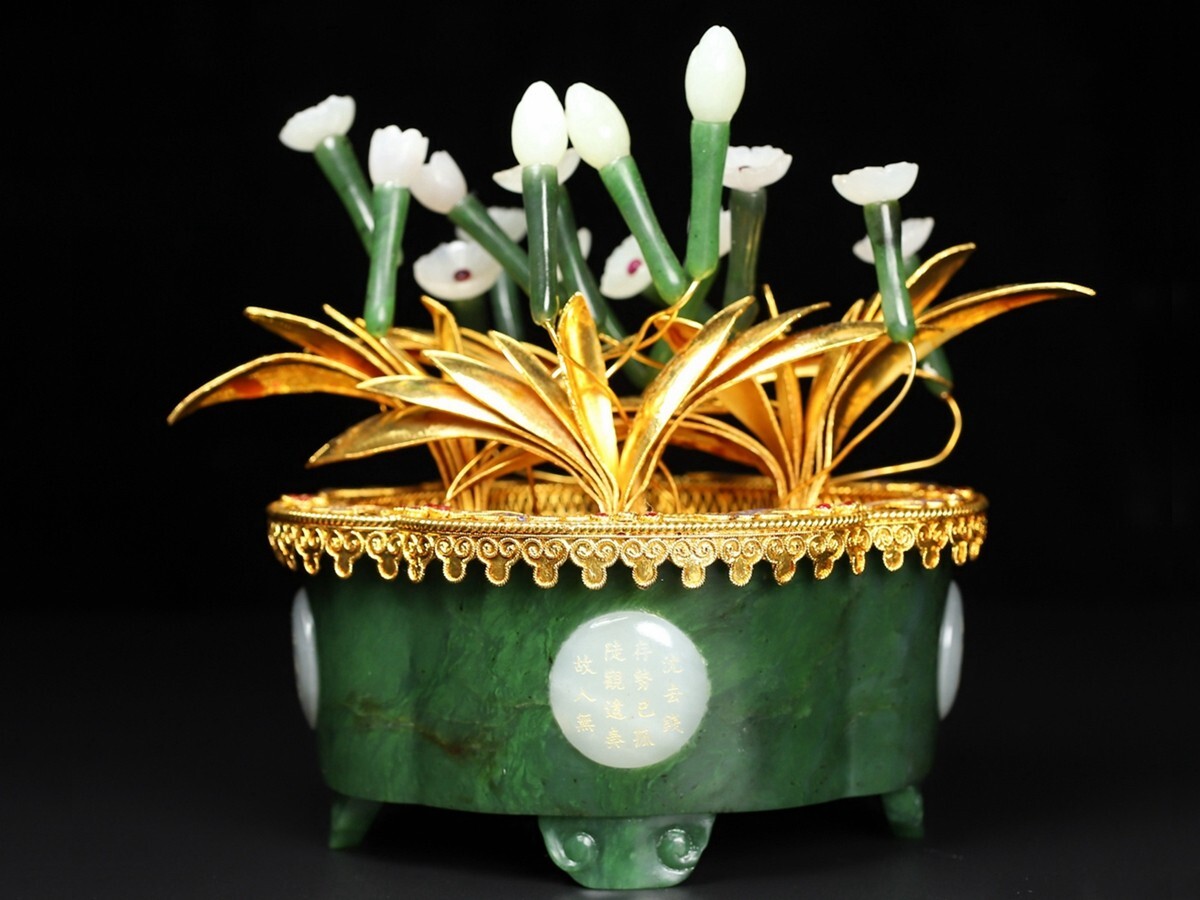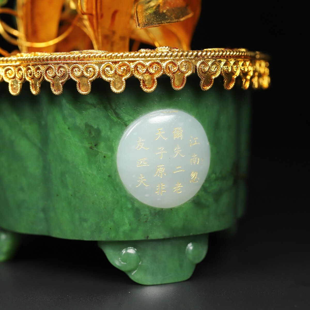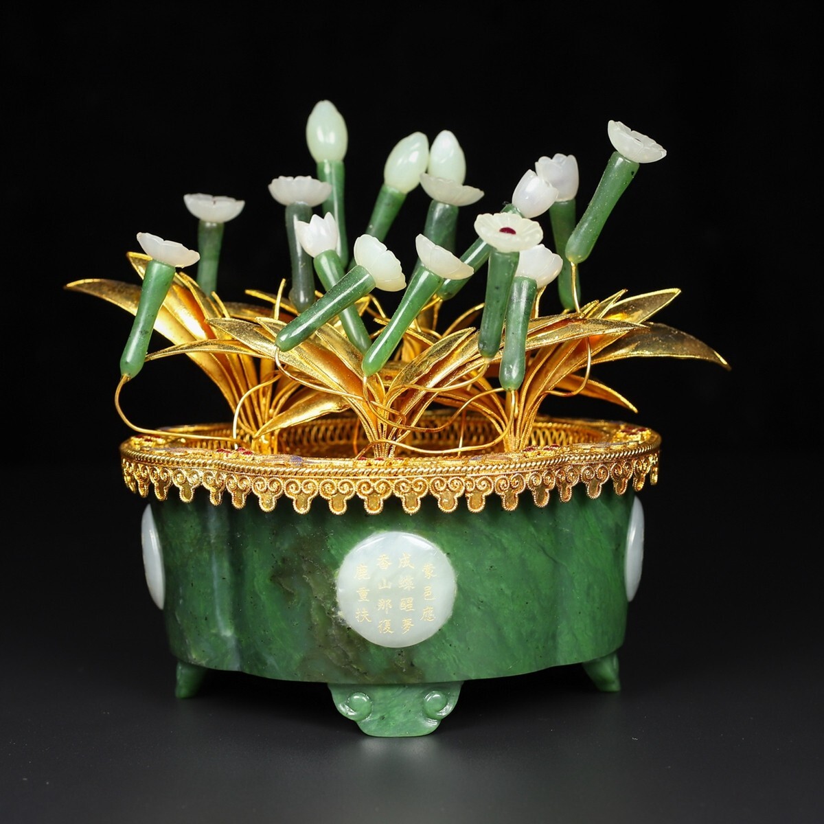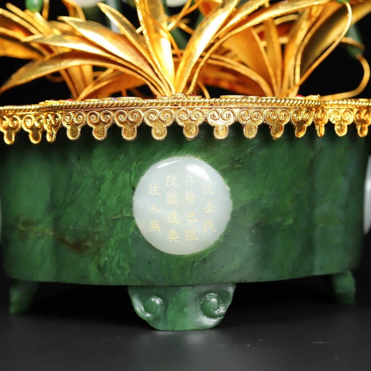 「清 乾隆御製 和田玉 碧玉彫り 花盆」極細工 擺件 中国古賞物 古美術 旧蔵出