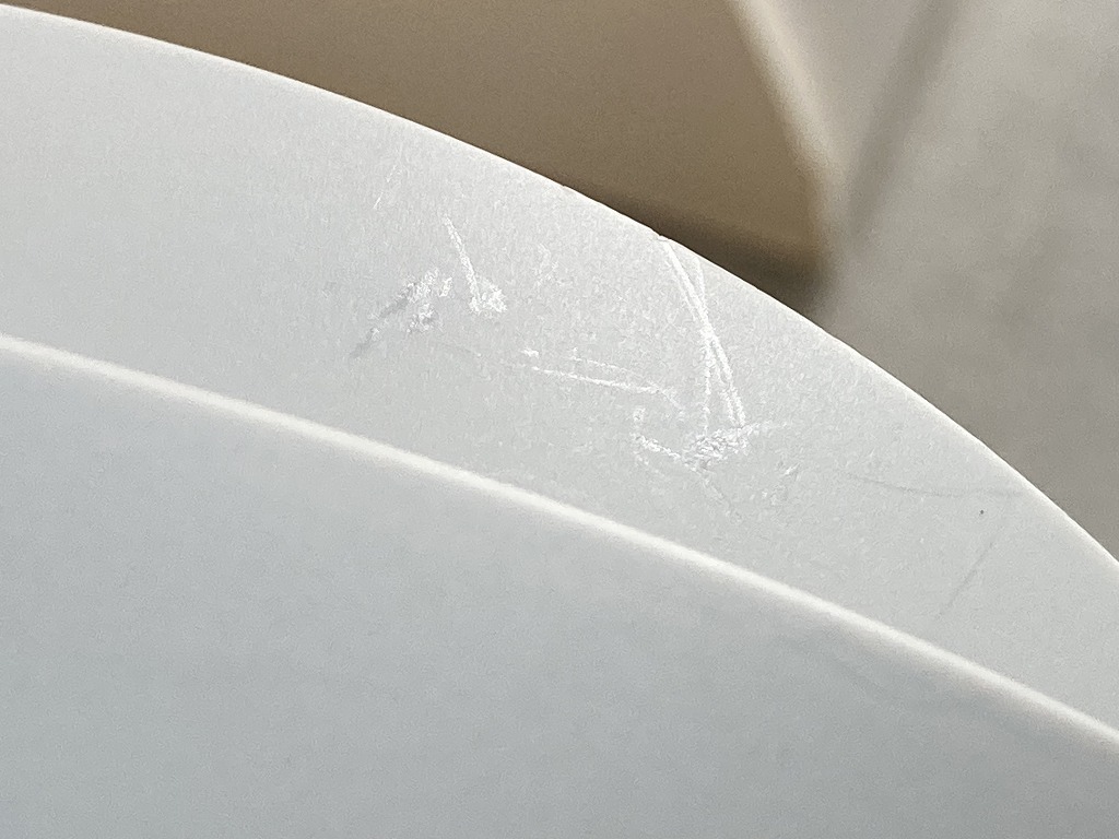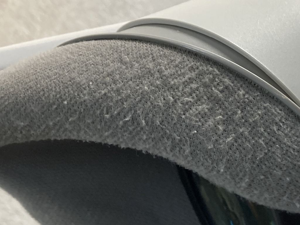 中古品。一見して大きな傷みは少なめですが、外装全体に擦れがあり、ひっかき傷やパッド部分にピリングが見られます。やや使用感を感じる状態です。