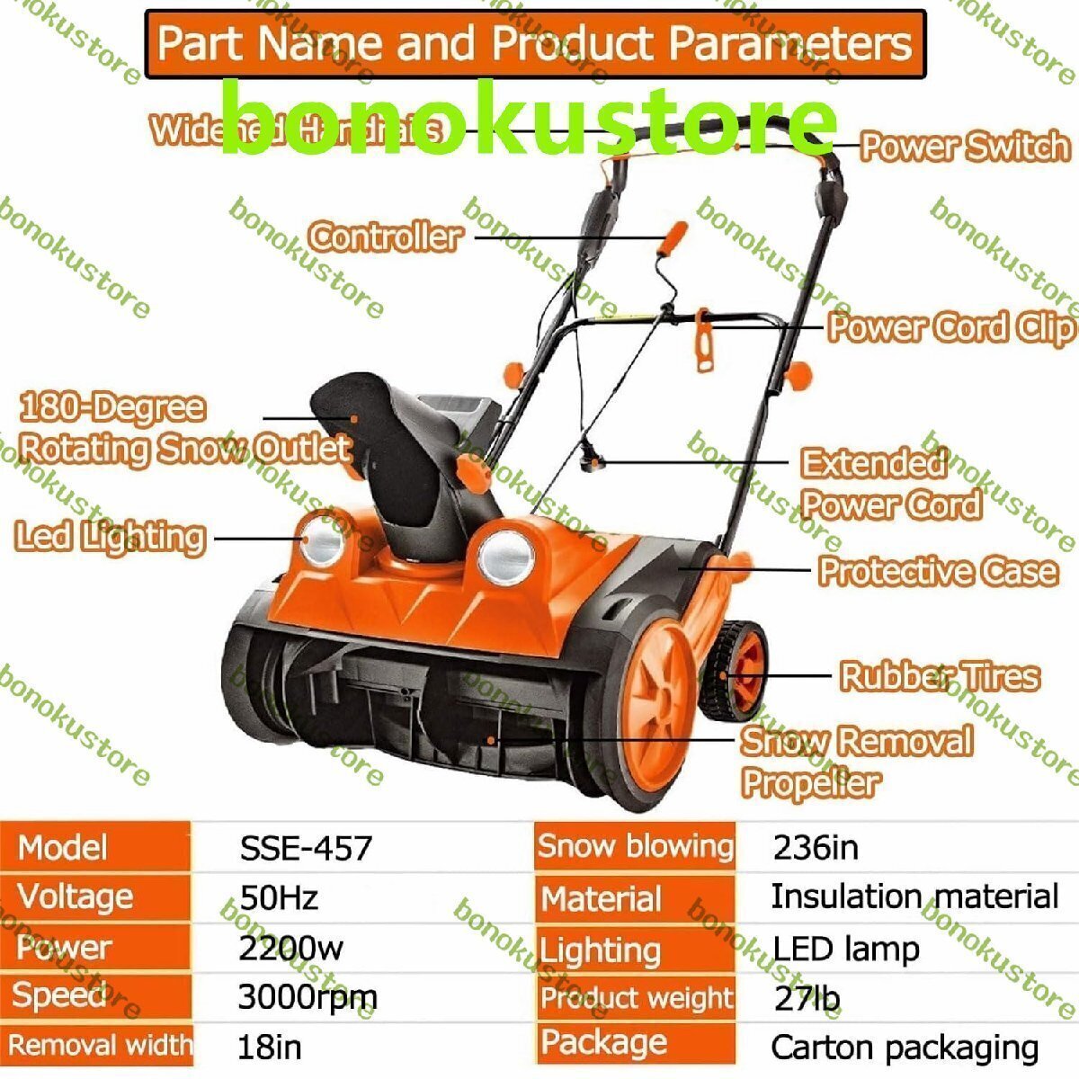 電動除雪機、20M電源コード付き、2200W 18インチポータブル除雪機、投雪距離6M、2 LED照明、180°シュート回転、パティオ、デッキ、公園、中庭用