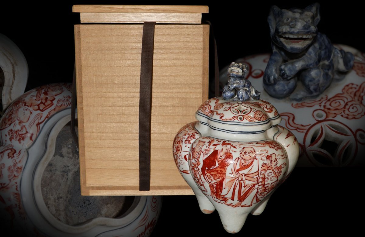 | 商品名 | 【江】時代 尾形周平作 赤絵松鶴鳥蛙人物文獅子摘三足香炉 高さ16.5㎝ 木箱 古美術品(茶道具香道具仏具)AX1792 CTDBqaaa CBvvxx |