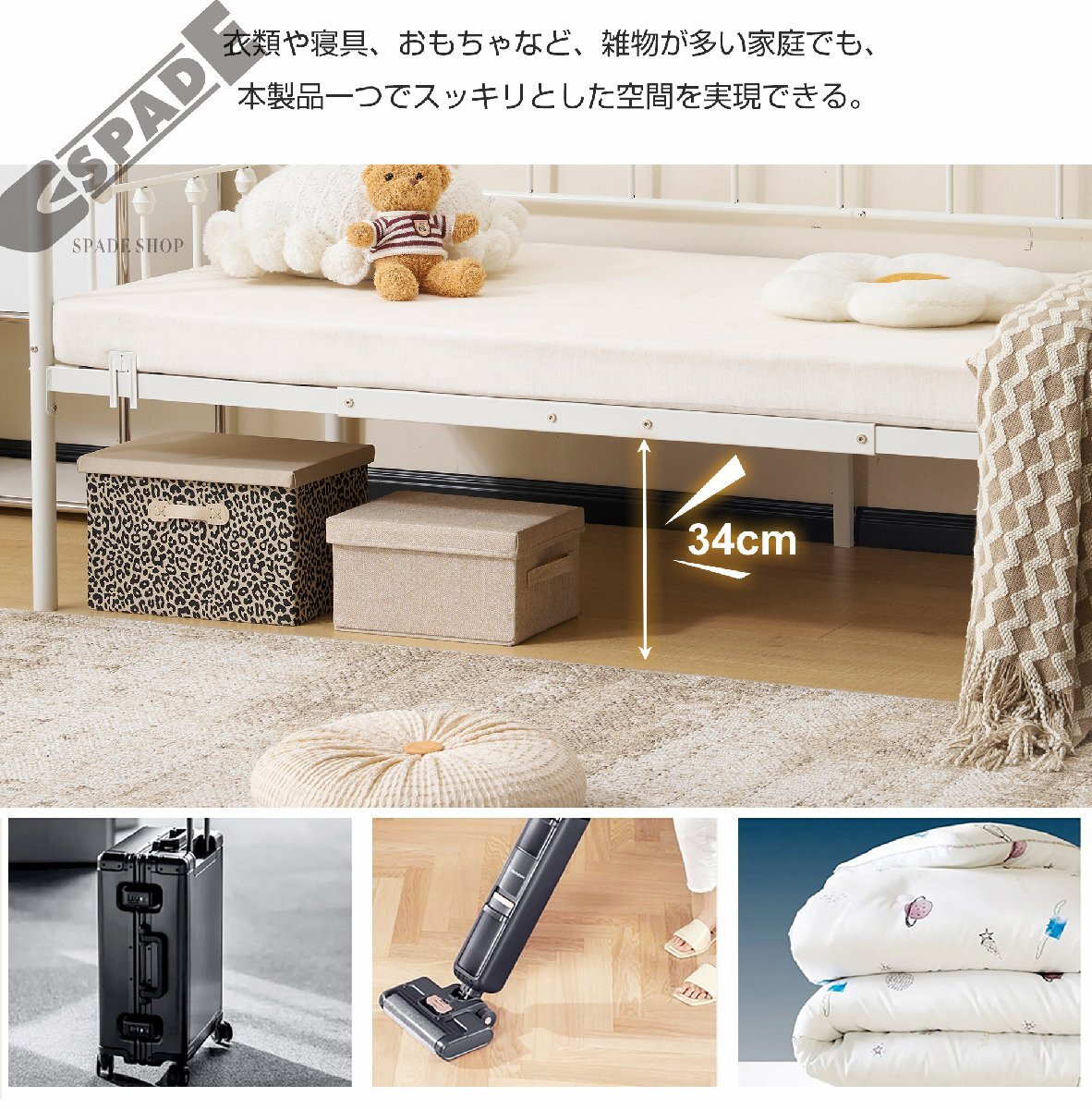 • 【ベッド下にたっぷりの収納スペース】 床板が高く、床下には34cmの収納スペースがあり、収納の利便性が際立っています。 さらに、十分な収納スペースが確保されているため、衣類、寝具、おもちゃなどの雑多なアイテムを整理整頓することができます。忙しい家庭や収納スペースが限られている方々にとって、このベッドは非常に便利です。収納ニーズに応え、スッキリとした空間を実現することができます。