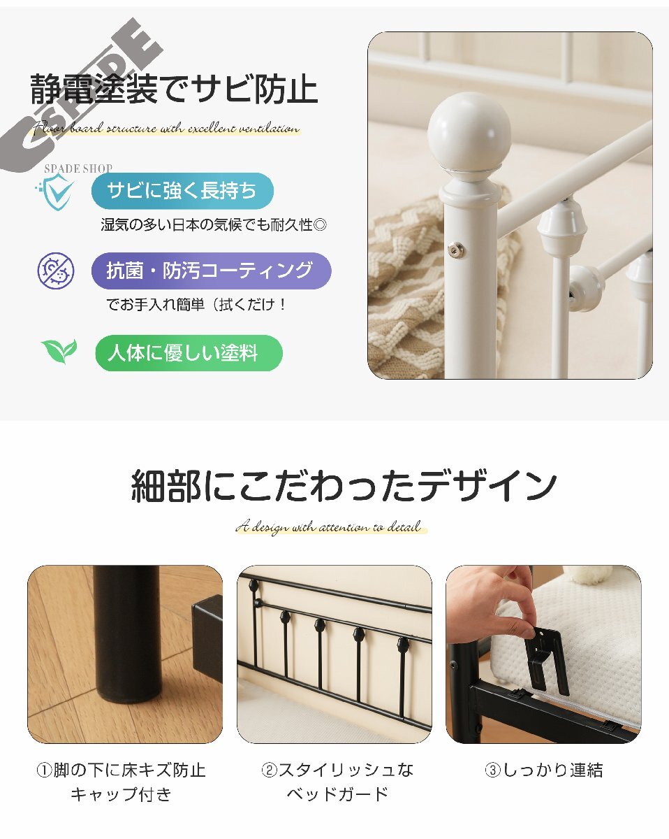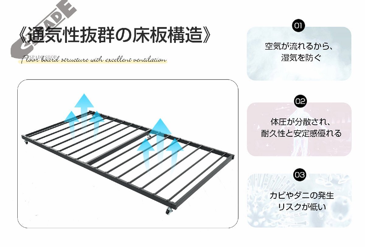 • 【空気流通性にも優れる】脚床面が高くなっているため、下の空間が通気性がよくなり、湿気やカビ、ダニの繁殖を防ぐことができます。さらに、重量を分散することで、安定感が増し、より安心してご使用いただけます。