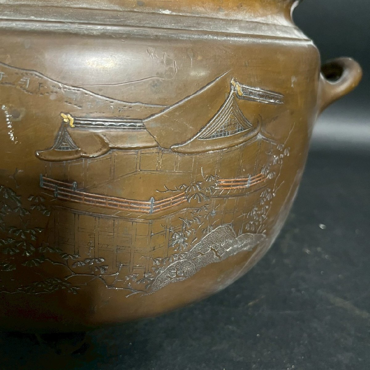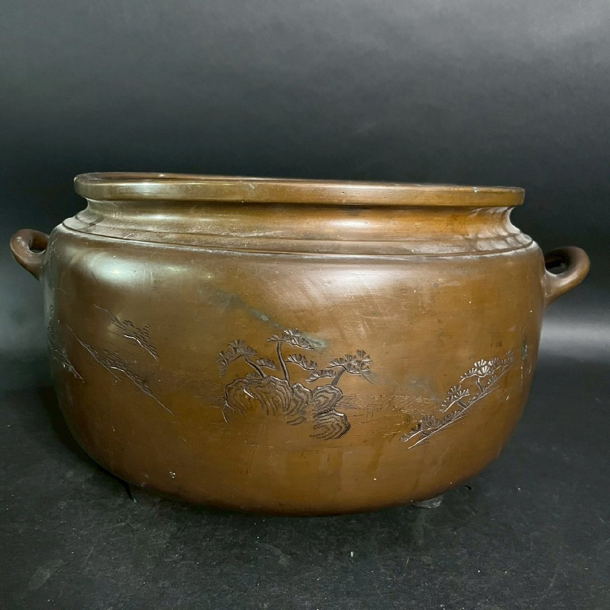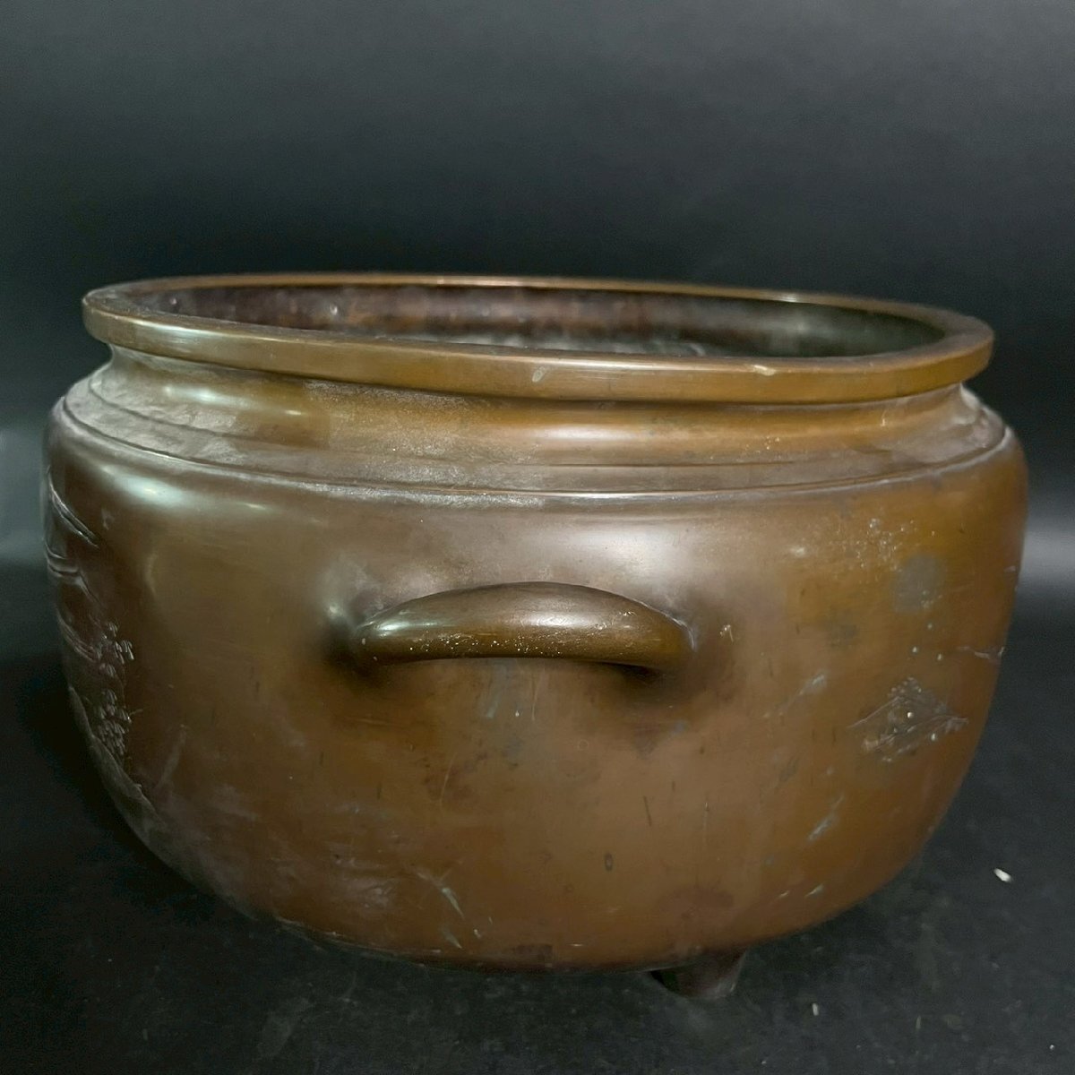 CV1021-59-3 火鉢 鉢 茶道具 銅器 銅製 鷹 彫刻 大型 炭火 伝統 工芸 骨董品 時代物 古民具 古道具 高さ24㎝ 口径36㎝ 120サイズ