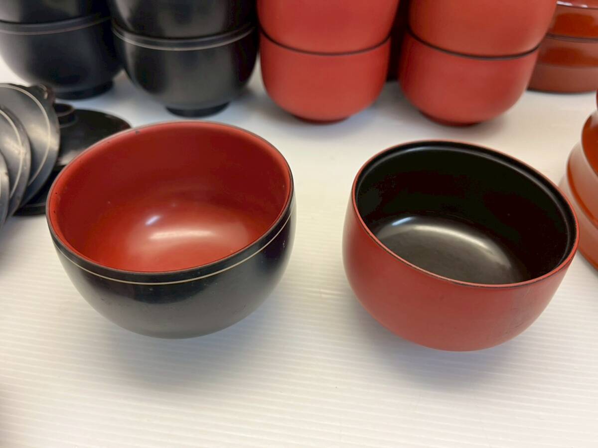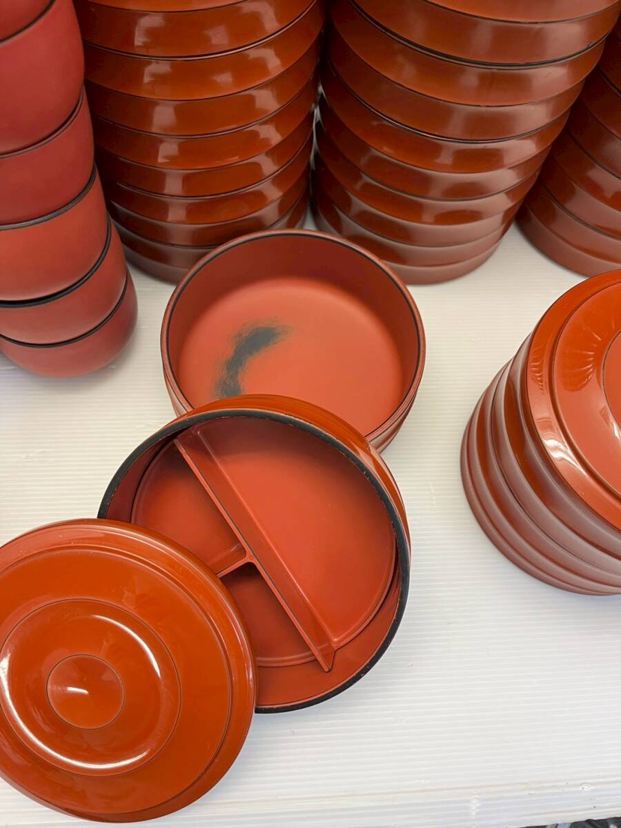 ■サイズ:(約)φ150×H45mm(上段 弁当箱)×50個 (約)φ150×H65mm(下段 弁当箱)×53個 ※弁当箱に付属する蓋は3枚 (約)φ90×H65mm(お椀 黒)×11個 ※お椀 黒に付属する蓋は7枚 (約)φ85×H60mm(お椀 赤)×13個 ☆お椀の蓋はおまけ。 ☆中古品です。多少の傷・汚れ・使用感はあります。画像をよくご確認の上、ご理解を頂ける方のご入札をお願いいたします。 ☆写真に写っているものが全てです。 ☆神経質な方のご入札はご遠慮下さい。 |