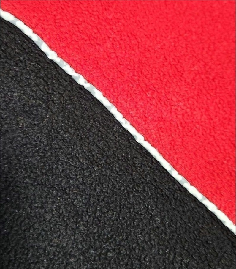 レッド×ブラックの切替配色が映える存在感ある1枚。