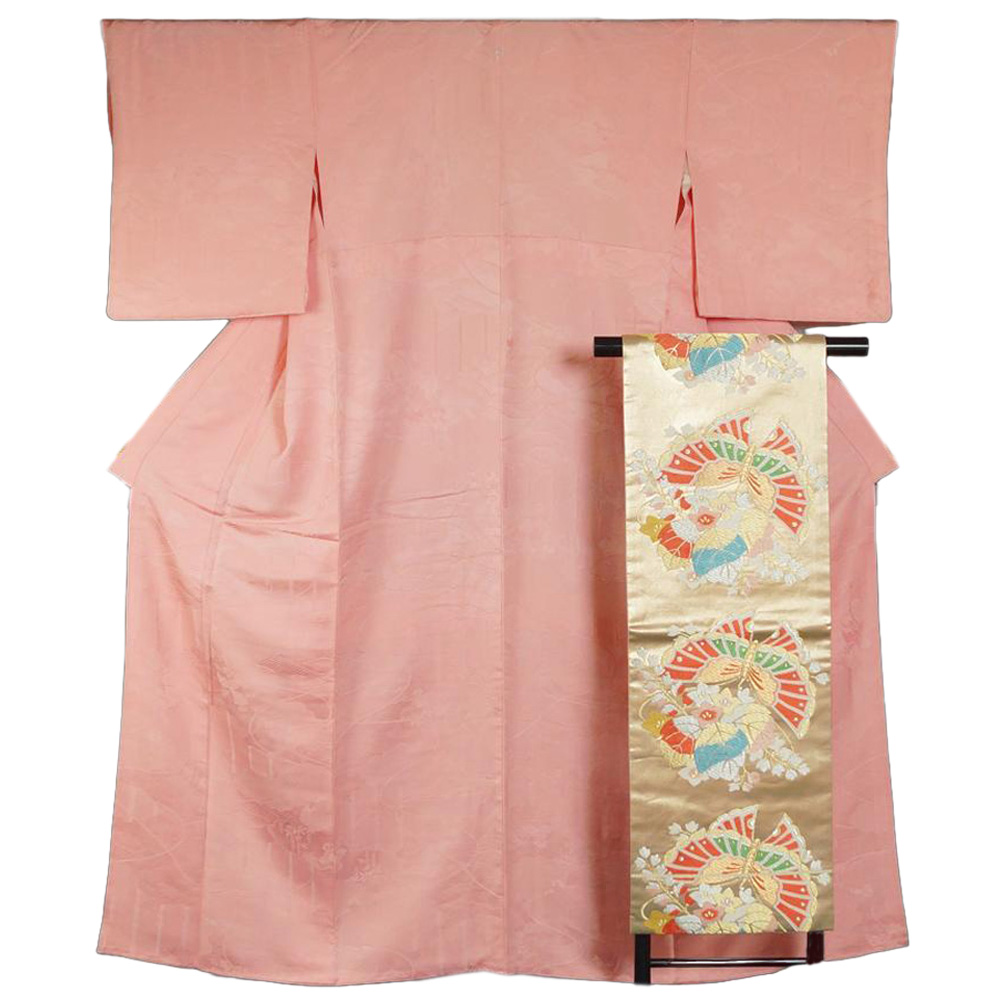| 商品 説明 | 雲取に春秋草花や波頭などの模様の地織が施された正絹地を鴇色系に染め上げた色無地と、金色系の地に胡蝶に桐模様が織られた名古屋帯の2点セットです。 お着物には丸に葵紋 縫い紋 一つ紋入りです。 |