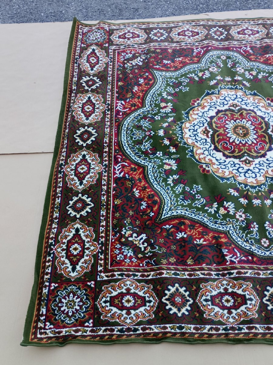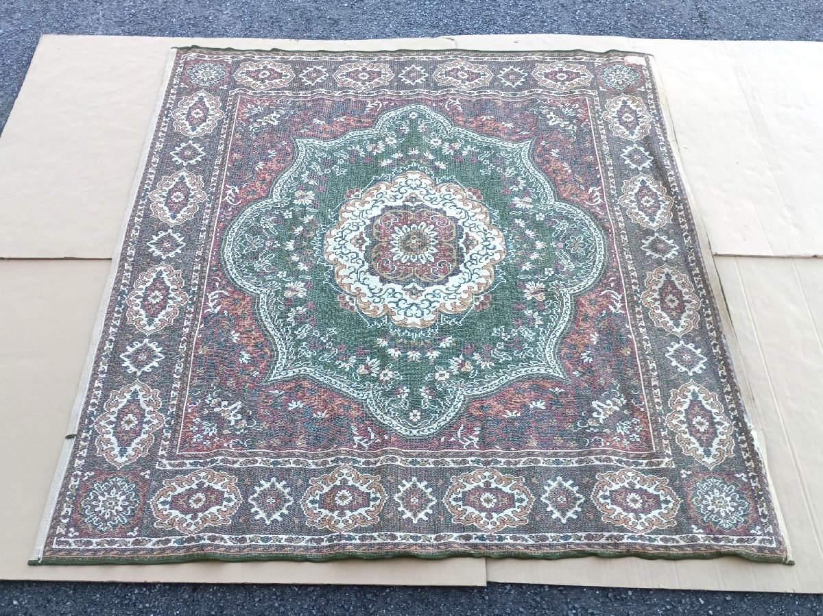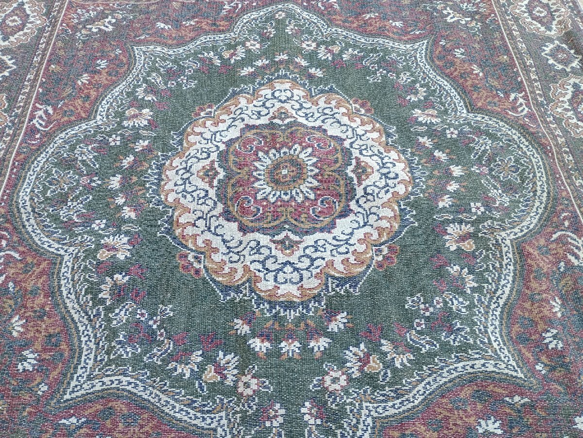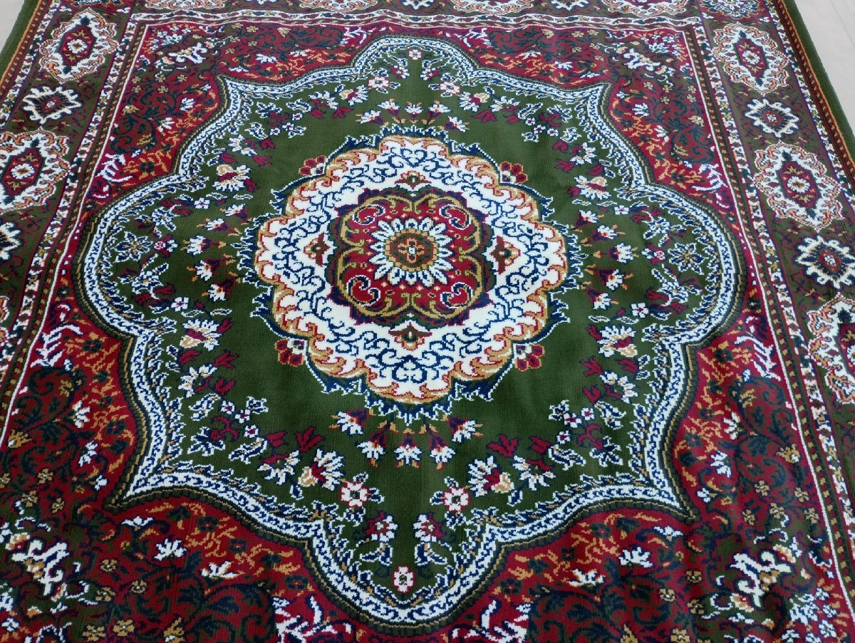 グリーンを基調に、中央のメダリオンと花柄模様が美しいクラシックで上品な印象の一枚です。 リビングや客間、和室・洋室問わずお使い頂けます。