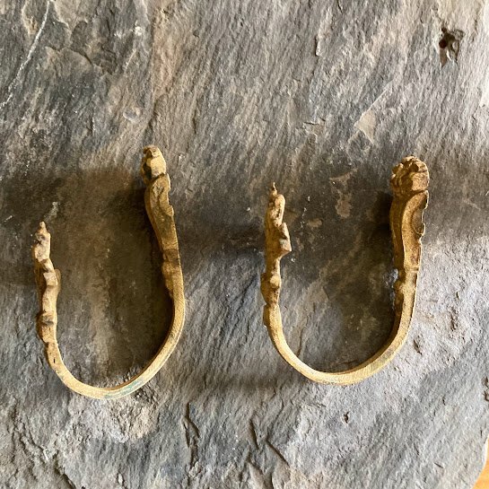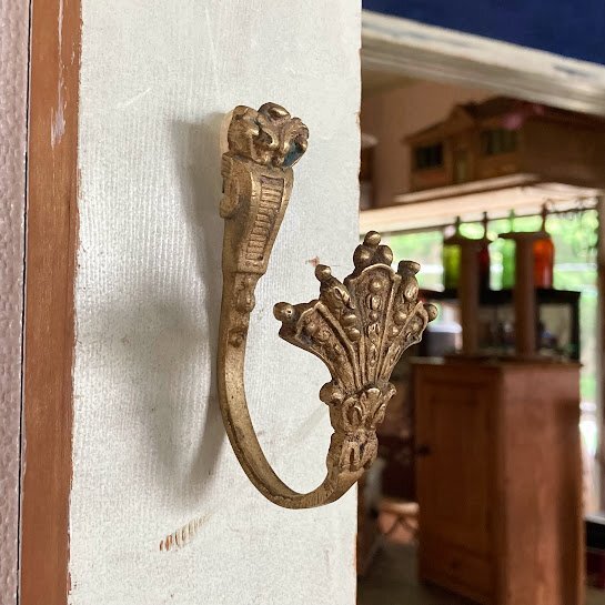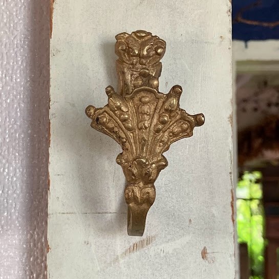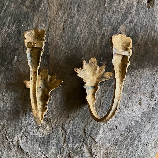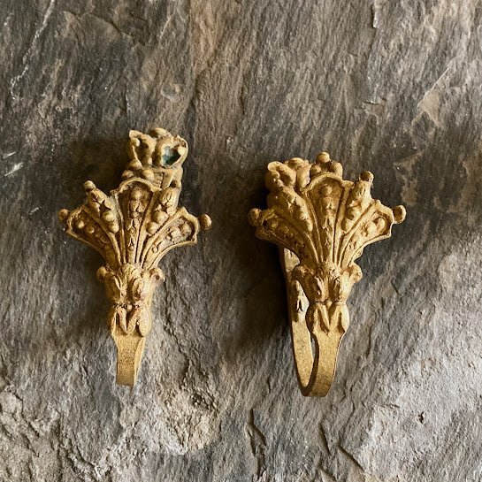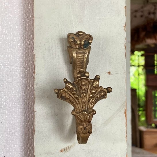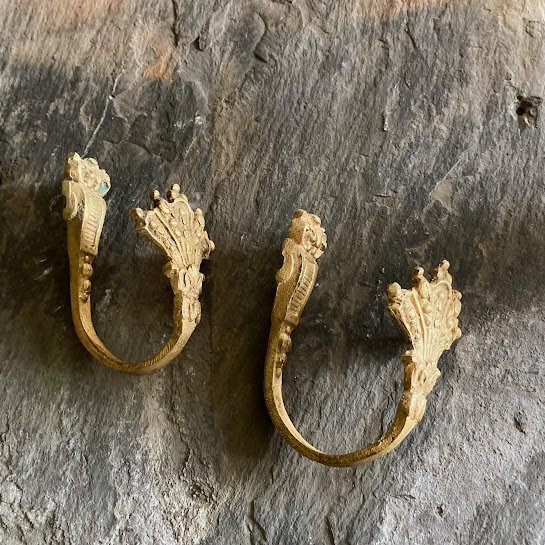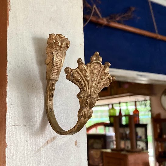 窓辺を彩るエレガントなアイテムが届きました【41-205】推定1940年代にフランスで活躍していたカーテンポルダー(2個セット)です。真鍮の落ち着いた雰囲気はタッセルやリボンと組み合わせて、お部屋を素敵に彩ります。レースや花柄のカーテンとの相性も完璧ですよ。裏側に刻印のような数字が刻まれていました。カーテンホルダー以外にも、玄関でいつも使うコートやバッグ、帽子を掛けてもいいですね。こちらは2個セットでのお届けとなります。福岡市南区の店舗にてお渡しもできますのでお気軽にどうぞ!