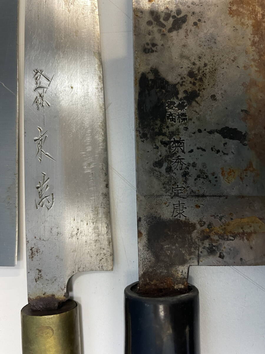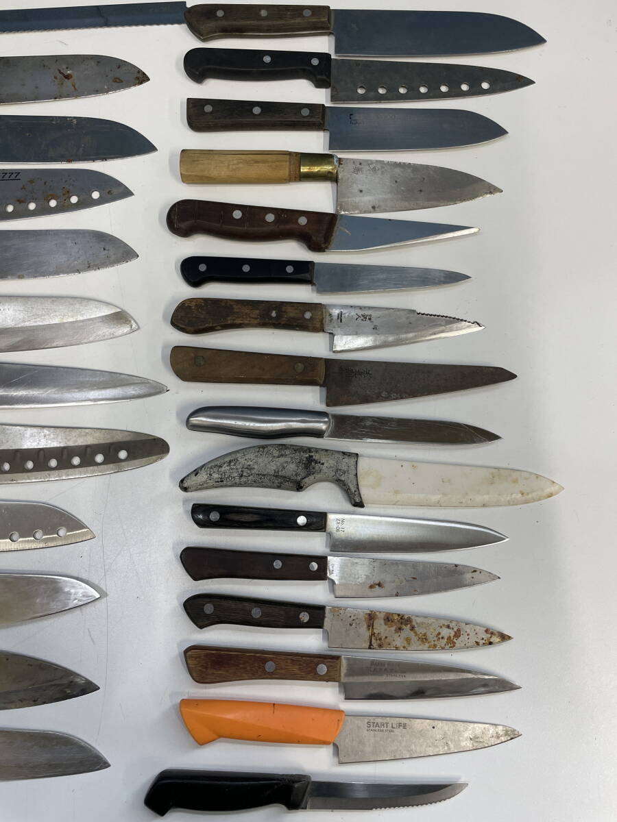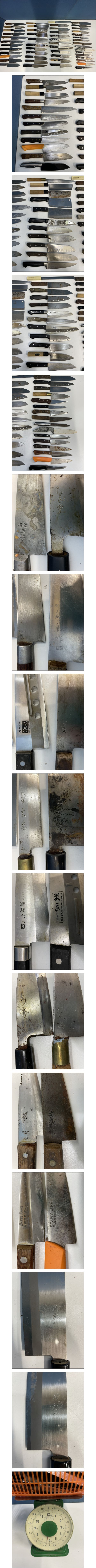 11-B2/1-80 包丁 和包丁 中華包丁 刺身包丁 パン切ナイフ 果物ナイフ 他 まとめて 51本セット 総重量約6.3㎏ 刻印 銘入有 含む | |||