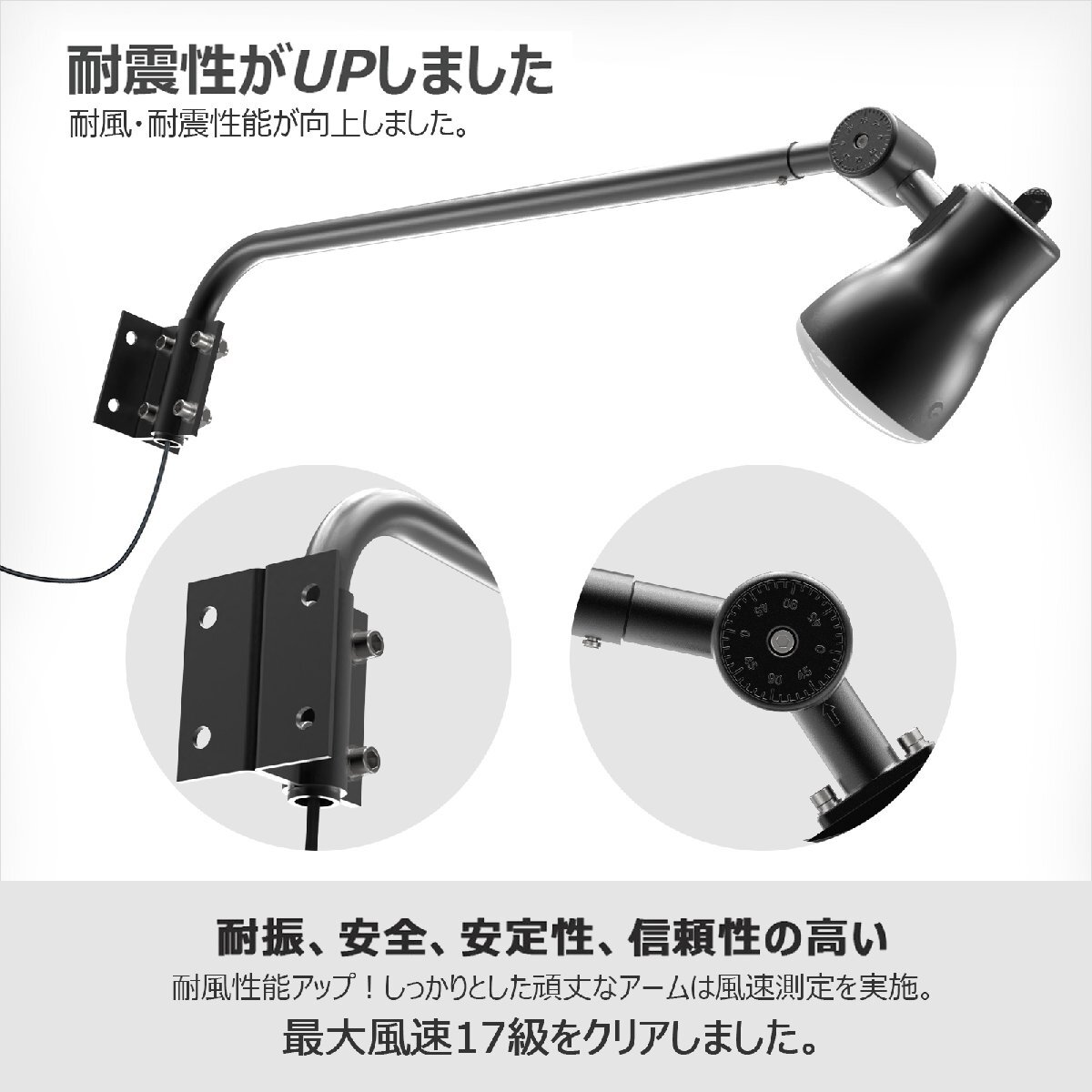 | 注意事項 | ※製品の改善・改良などのため、予告なく製品の仕様変更を行うことがありますので、ご了承ください。 ※振動や衝撃の影響の受ける場所には取付けないでください。 ※壁面の強度が十分にある場所に取付けてください。 ※補強ワイヤーでアームと灯具を固定してください。 ※屋外用防雨形です。プールその他、湿気、水分の多い場所に、粉塵・腐食性ガスの発生する場所、ご使用しないでください。 ※耐塩仕様ではありません、塩害地域に取付けないでください。 | ||