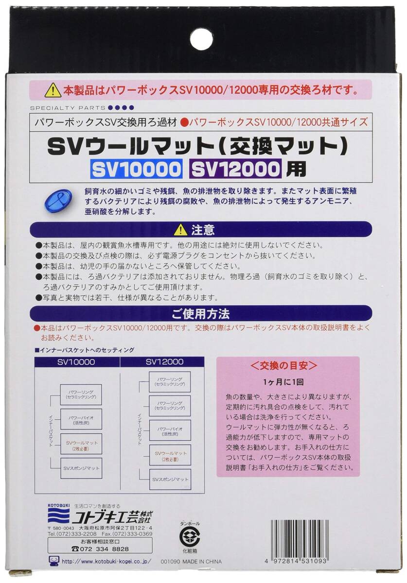 商品紹介SV10000/12000 SVX1000/1200用に適用した専用ろ過材。飼育水の細かいゴミや残餌、魚の排泄物を取り除きます。またマット表面に繁殖するバクテリアにより残餌の腐敗や、魚の排泄物によって発生するアンモニア、亜鉛酸を分解します。原材料・成分不織布使用方法本品はコトブキ外部フィルター用のウールパッドです。その他の製品には適合しません。