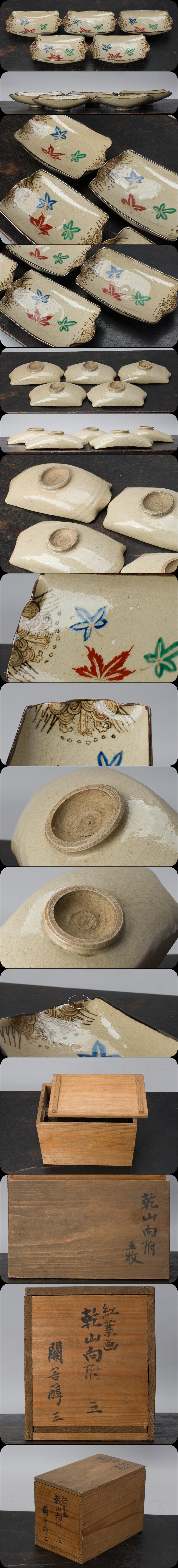 | 京焼、紅葉画向付5枚。江戸期。共箱有。 サイズは、幅約17.5x9.5cm、高さ約4.5cm。 1枚に小さな欠けあります。 他4枚は傷・直しありません。 状態・詳細は、画像でご確認お願いいたします。 画像にある木箱付属します。 器の大きさが箱に対してやや大きなものがあり、そのため箱内部の上の方が 削られています。やや大きめのお皿を上の方に入れて収納します。 |