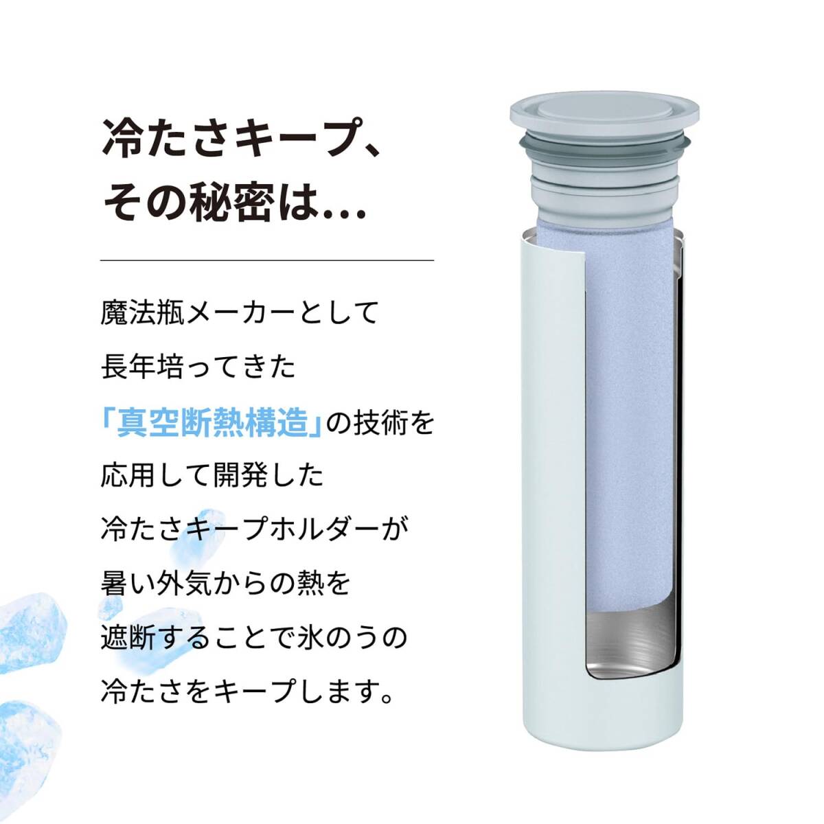 ・素材・材質:内びん/ステンレス鋼、胴部/ステンレス鋼 (アクリル樹脂塗装)、氷のう本体/シリコーンゴム、口金/ポリプロピレン、キャップ/ポリプロピレン、パッキン/シリコーンゴム
