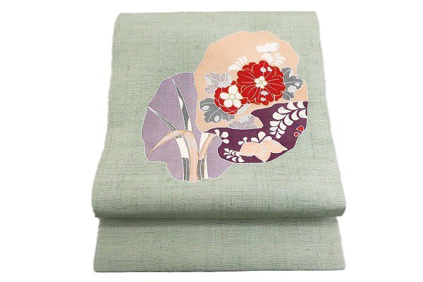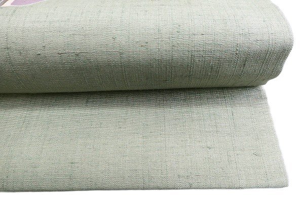 | 【送料無料】未使用品 名古屋帯 紬地 淡い緑 草花 長さ3m67cm カジュアル お洒落 普段着 正絹 着物フィ m-8425 |