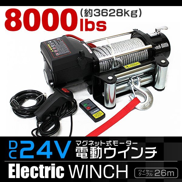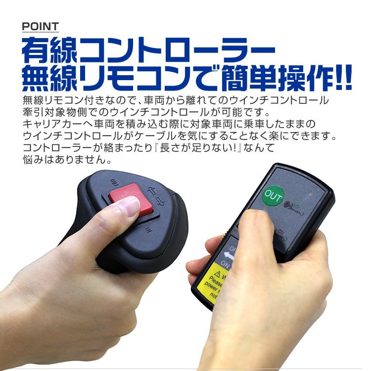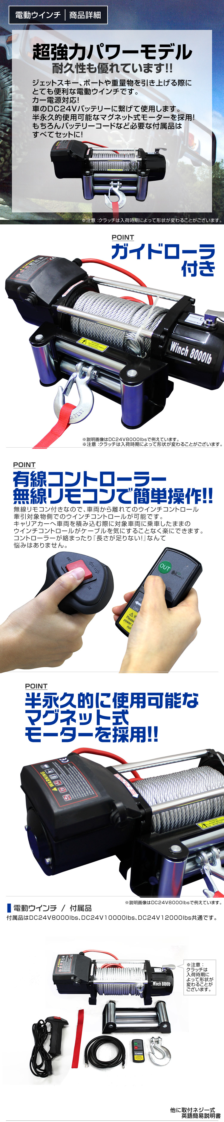 | 最大牽引力3628kg!! ジェットスキー、ボートや重量物を引き上げる際にとても便利な電動ウインチです。 カー電源対応!車のDC24Vバッテリーに繋げて使用します。無線リモコン付きなので、車両から離れてのウインチコントロール、牽引対象物側でのウインチコントロールが可能です。 |