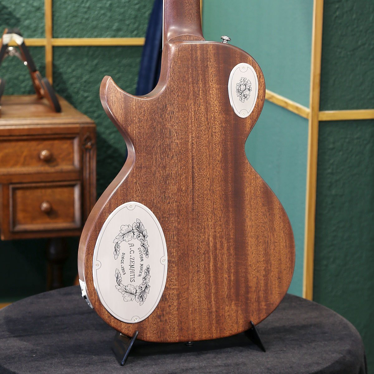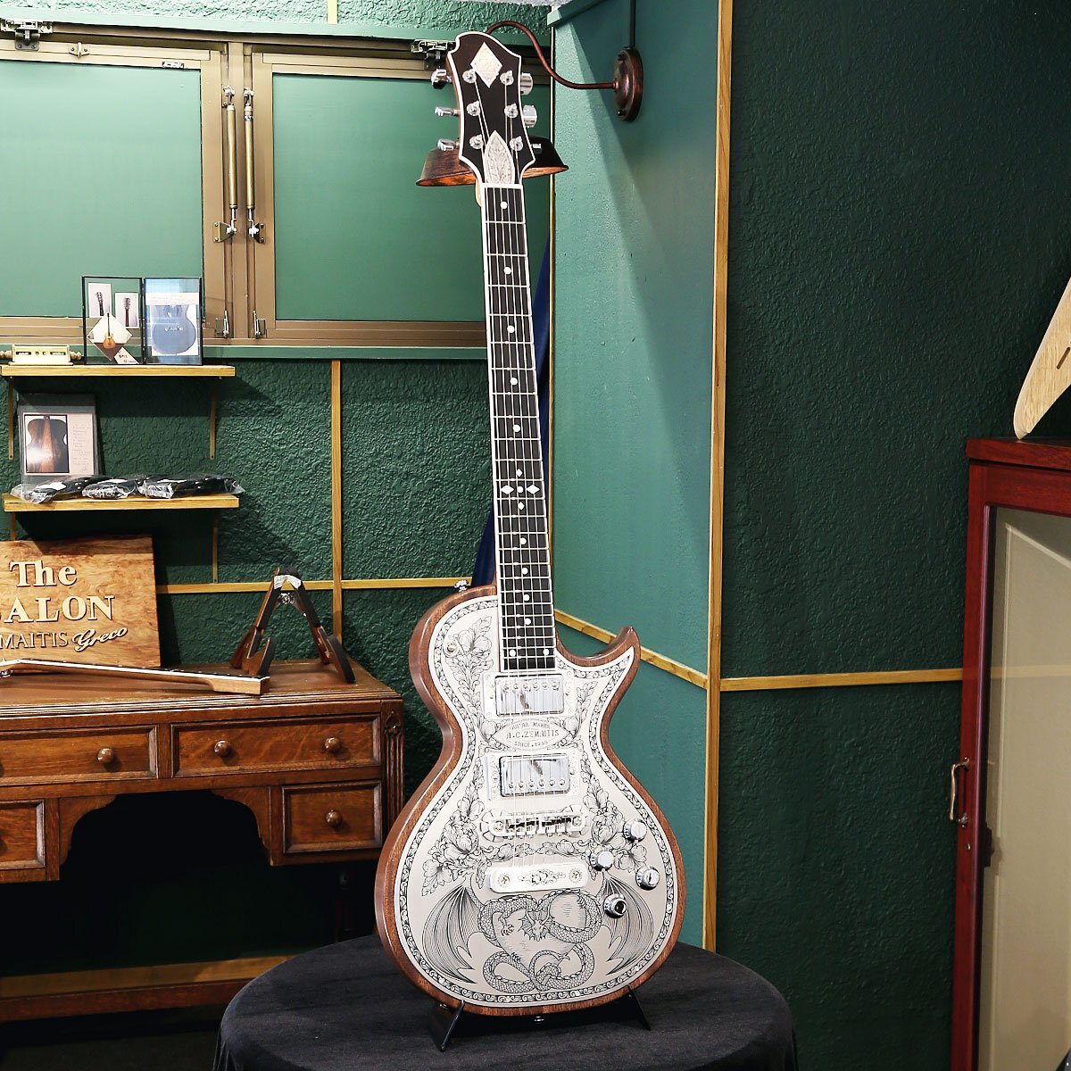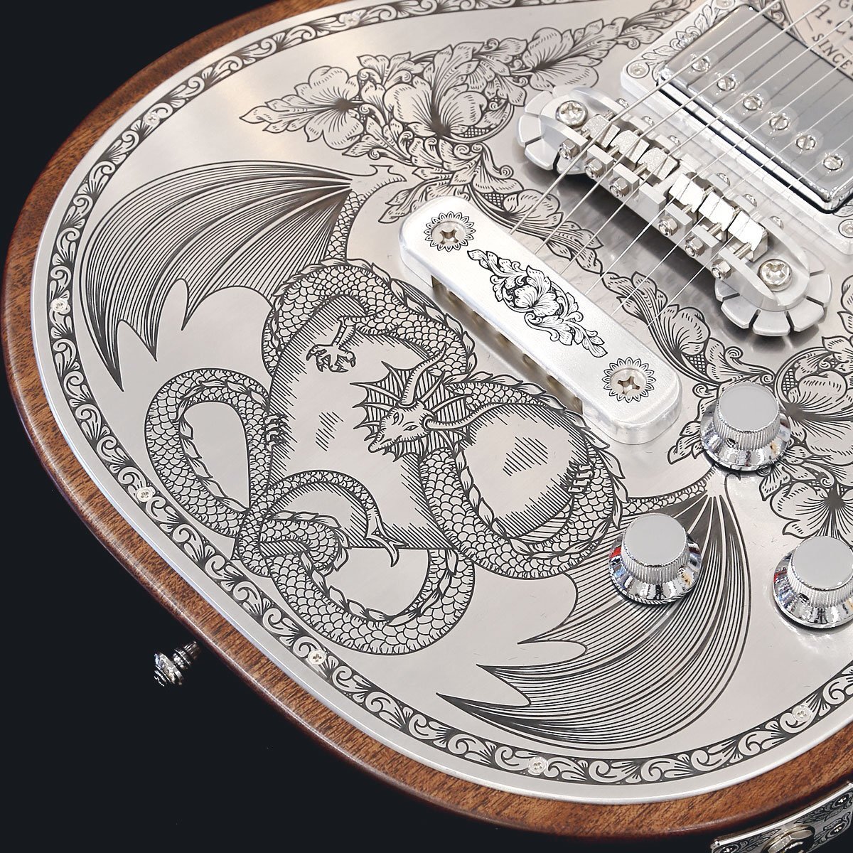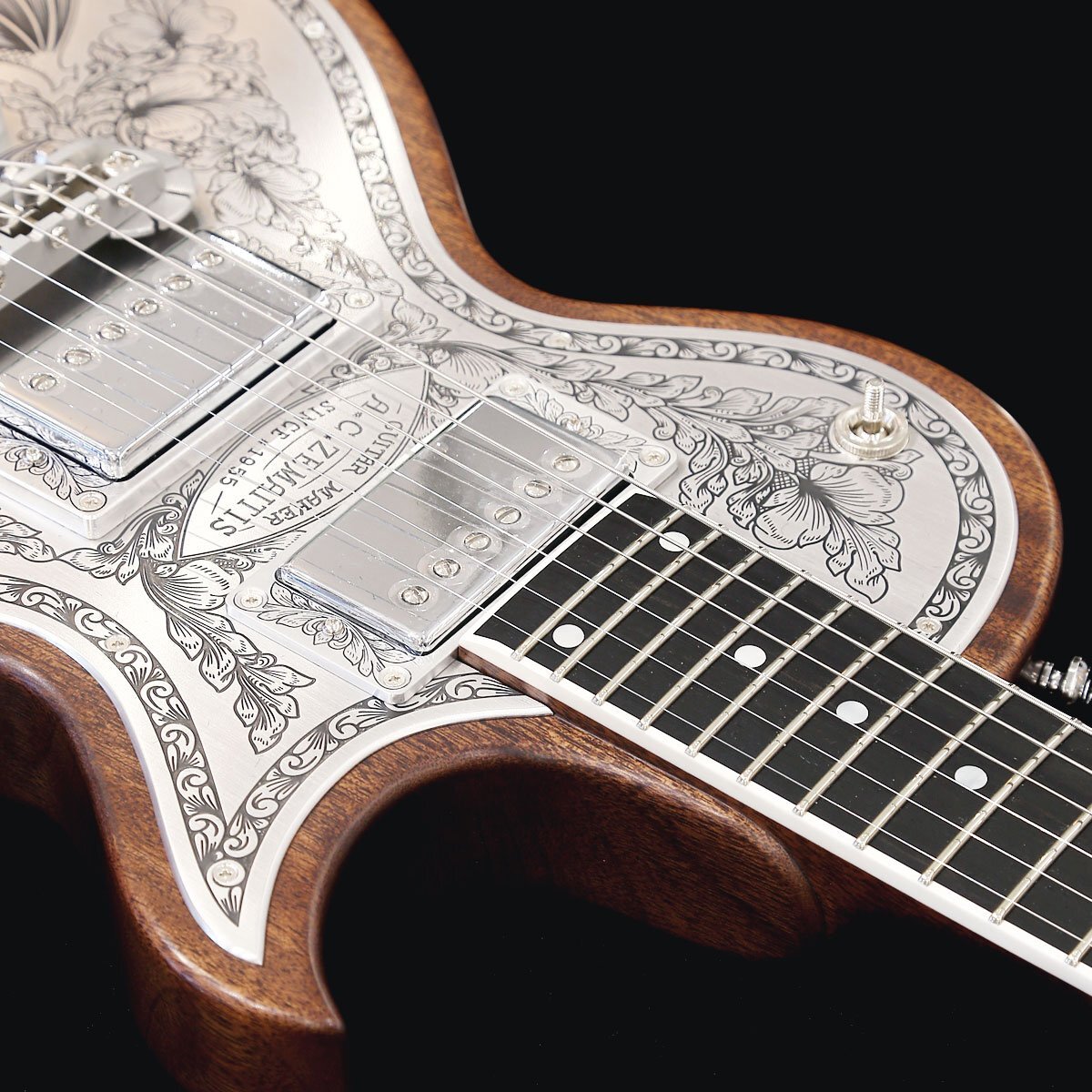 ゼマイティスより、トップに彫金装飾を用いたメタル・フロント・モデル「MFG-AC-24 Dragon & Heart」が登場しました。 MFG-AC-24はウェストのくびれが大きいシングル・カッタウェイのボディー・スタイルで、ボディーとネックに厳選されたアフリカン・マホガニー、フィンガーボードはエボニーを使用しています。 635mmのスケールで、セット・ネック・ジョイント、ミディアム・サイズの24フレット仕様で、ブリッジ後方に「Dragon & Heart 」のデザインを採り入れたモデルです。 「ドラゴン」と「ハート」という別々のモチーフを昔の映画のタイトルからヒントを得て、組み合わせて生まれたデザインです。 ゼマイティス・オリジナルのアルミ合金を使用したブリッジ&テイルピースを搭載し、ゼマイティス独自のトーンを生み出す要素となっています。 同様にアルミ合金を用いたヘッドのダイアモンド・エンブレム、トラスロッド・カバー、テイルピースやピックアップ・リングをはじめ、アウトプット・ジャック・プレート、コントロール&スイッチ・バック・プレートに至るまで装飾を施しています。 ピックアップは、メタル・カバード・タイプのDragon Classicハムバッカーを2基搭載、コントロールは定評のあるCTSポットを使用し、各ピックアップ・ヴォリュームと各ピックアップ・トーンのレイアウトです。 スイッチクラフト製の3ウェイ・ピックアップ・セレクター・スイッチを備え、トーンのキャパシターはオレンジ・ドロップを使用しています。 さらに信頼性の高いゴトー製のチューナーを使用しています。フィニッシュはラッカーを使用し、カラーはナチュラルとブラックの2カラーをラインナップしています。 英国発祥のゼマイティスらしさや伝統的なメタル・フロントならではのデザインを前面に出しつつ、最前線でプレイするギタリストやギター・テクニシャンたちへの徹底的なヒヤリングを重ね、現代のプレイヤーが求める要素を注入したモデルに仕上がっています。 ●2つのピックアップの間には、「A.C.ZEMAITIS SINCE1955」の文字が彫金されている。 ●ピックアップ・リングは、最新の弦の角度にあわせたアングル付きではなく、あえて従来のフラット・タイプを合わせることでクラシックな印象を持たせた。 ●「ドラゴン」と「ハート」という別々のモチーフを昔の映画のタイトルからヒントを得て、組み合わせて生まれたデザイン。 ●Back View: アルミ合金に装飾を入れた高級感のあるバック・プレートを装着。 SPEC ■Body Top: Duralumin ■Body Back: Select African Mahogany ■Neck: Select African Mahogany ■Neck Joint: Set neck ■Nut Width: 43mm (1-11/16") ■Nut: Bone ■Fingerboard: Bound Ebony ■Scale: 635mm (25") ■Frets: 24 Medium ■Neck Pickup: Dragon Classic Neck ■Bridge Pickup: Dragon Classic Bridge ■Radius: 305mm (12") ■Controls: 2 volume, 2 tone, 3-way toggle ■Tuners: Gotoh SG301-01-Chrome ■Finish: Lacquer ■Protection: Hard Shell Case ■Strings: Nickel Plated Steel (.010, .013, .017, .026, .036, .046) ■Colors: Natural |