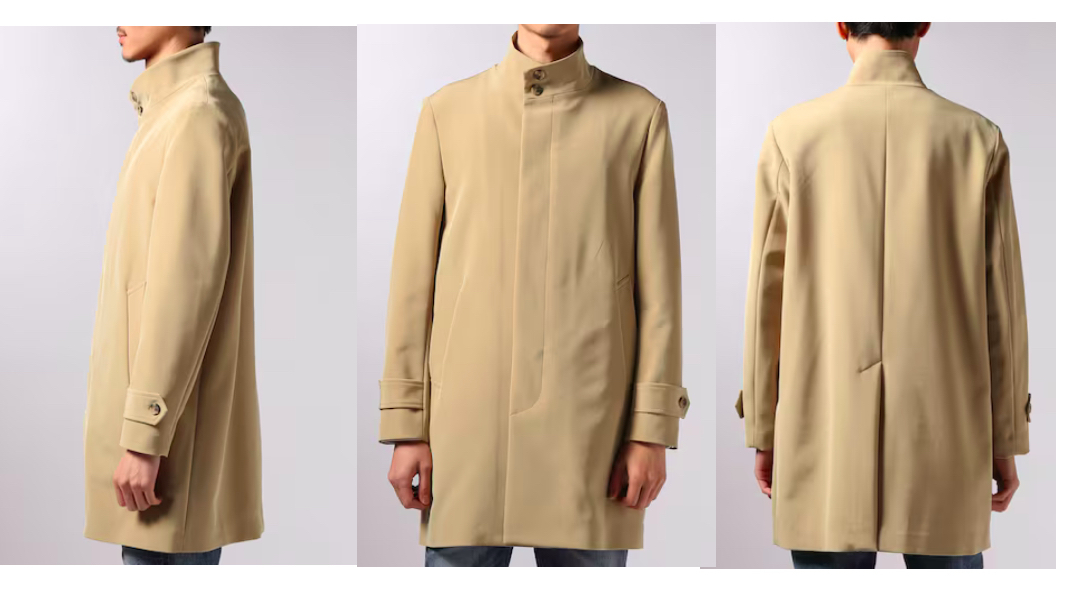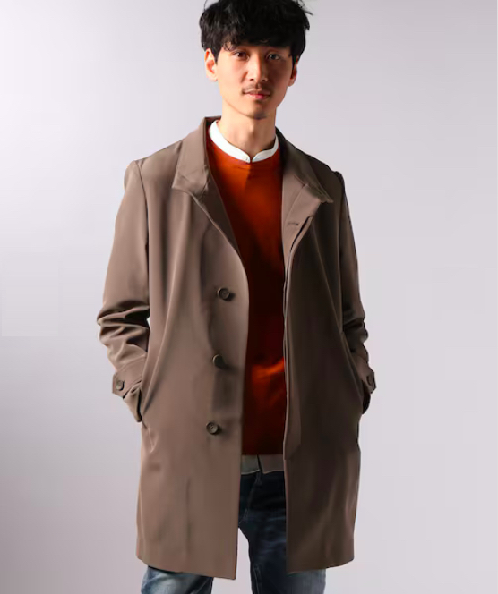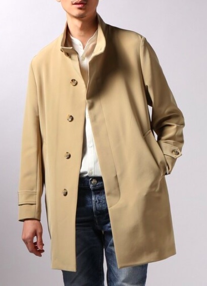 EDIFICE きれいめコート。無駄を省いたミニマムなデザインが特徴的なスタンドカラーコート。前を開けた状態でも広がりすぎないように計算されたシルエット。とろみのある生地感のきれいなドレープにほどよく光沢感があり大人が着れるデザイン