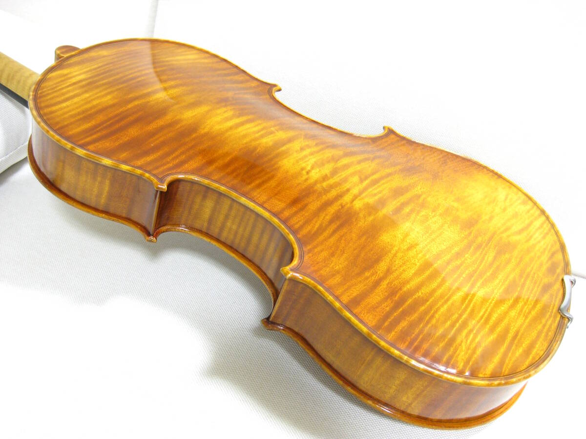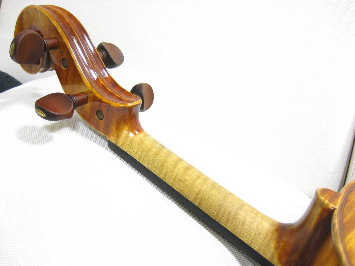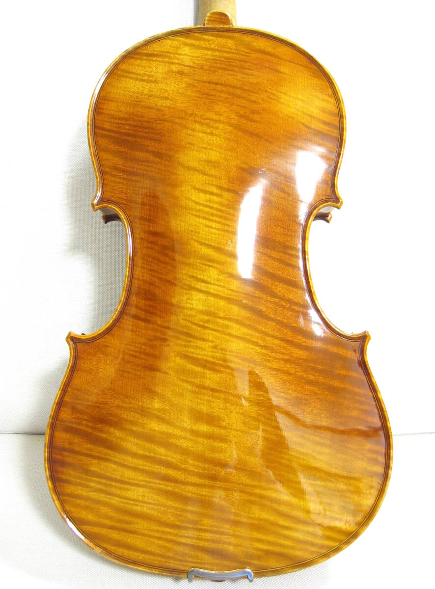 ビオラでは珍しい裏板1枚板の豪快な虎杢がとても美しい逸品となっております。