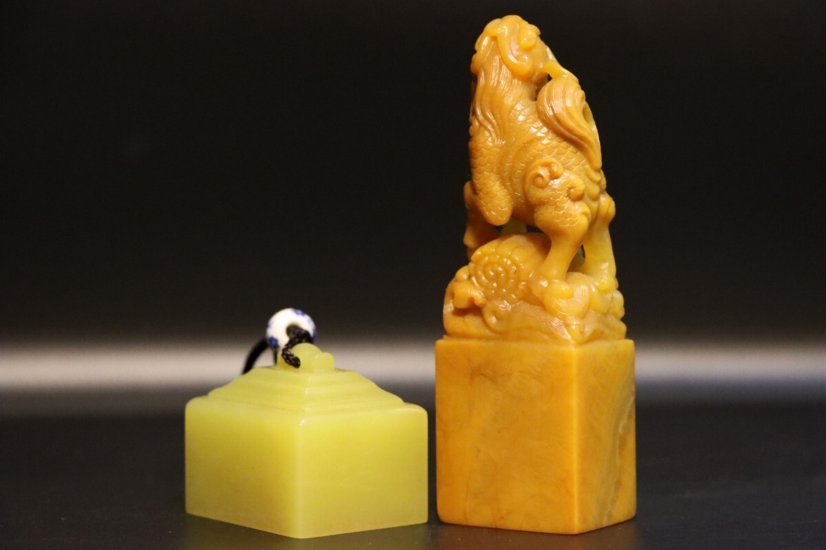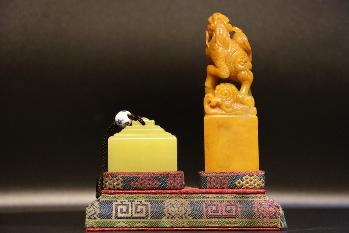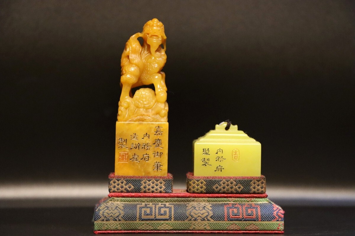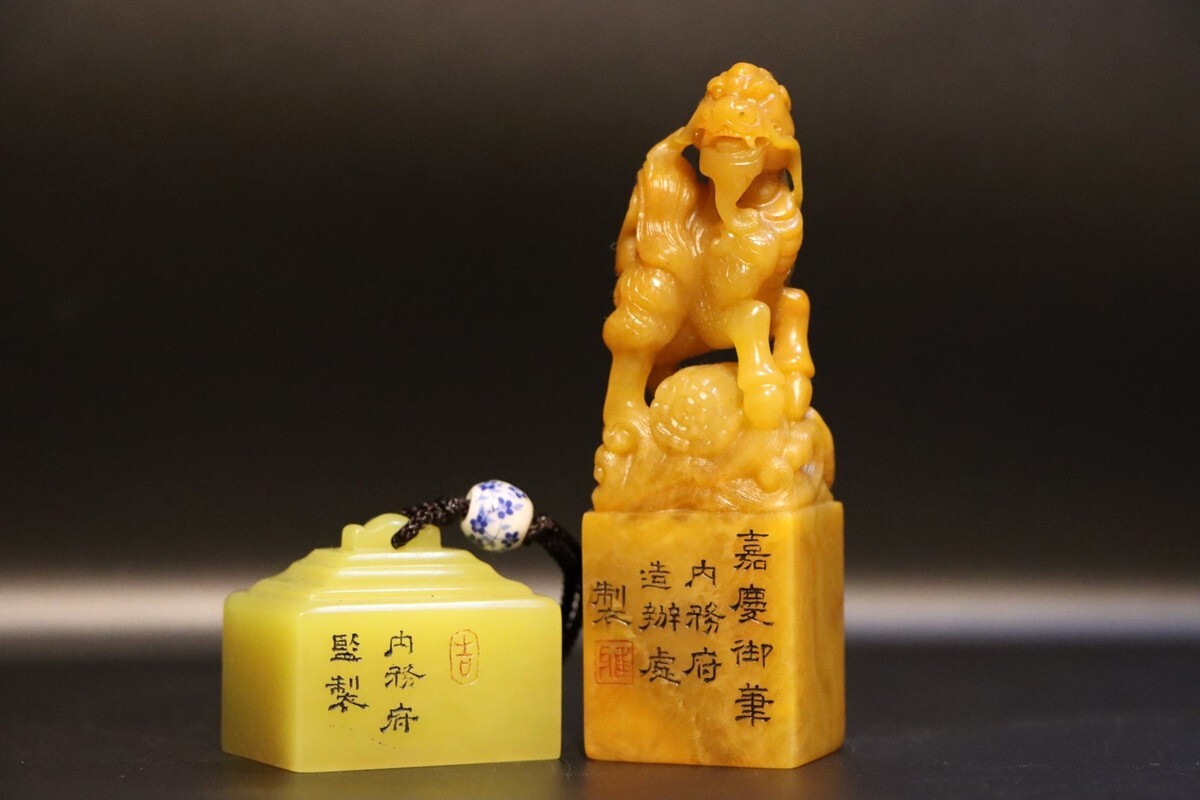 「清 内務府造弁処製 老寿山石 田黄石彫り 麒麟 対印 印鑑」極細工 擺件 古賞物 中国古美術 旧蔵出